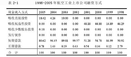下表 2-1 顯示的是 1998 年至 2005 年我國(guó)航空工業(yè)公司在已上市公司中的融資方式以及地區(qū)的分布比例。從圖表中可以看出,我國(guó)航空工業(yè)行業(yè)上市公司的權(quán)益性融資多數(shù)是吸收性質(zhì)的投資。但在 2001 年之后權(quán)益性融資減少直接融資途徑使用增多,負(fù)債性融資多為短期的借款,且目前已經(jīng)達(dá)到融資規(guī)模的八成以上。一個(gè)國(guó)家想要加快工業(yè)化現(xiàn)代化的發(fā)展,航空工業(yè)無(wú)疑是推動(dòng)其發(fā)展的先導(dǎo)產(chǎn)業(yè),縱觀世界上許多發(fā)達(dá)的國(guó)家,多數(shù)都是通過(guò)發(fā)展航空工業(yè)將自身的工業(yè)化現(xiàn)代化發(fā)展起來(lái)的。據(jù)不完全統(tǒng)計(jì),在全球范圍內(nèi)有超過(guò) 20%的國(guó)家都有獨(dú)立的航空航天基地,在數(shù)量和規(guī)模上各有差異,其航空企業(yè)的數(shù)量也日益增多。平均每年的營(yíng)業(yè)收入在 2 000 億至 3 500 億美元之間。當(dāng)前看來(lái)全球中北美西歐以及加拿大、俄羅斯等地區(qū)的航空航天工業(yè)較為發(fā)達(dá),其中以美國(guó)最為發(fā)達(dá)占據(jù)了全球 60%多的營(yíng)業(yè)收入。美國(guó)的航空航天業(yè),發(fā)展如此之成功不僅在于其發(fā)展的規(guī)模巨大,還表明美國(guó)航空技術(shù)的完善發(fā)達(dá)。落眼于我國(guó)的航空航天產(chǎn)業(yè),可以發(fā)現(xiàn)我國(guó)的航空軍工工業(yè)發(fā)展基礎(chǔ)尤為薄弱。自從改革開(kāi)放以來(lái),我國(guó)的航空航天技術(shù)從無(wú)到有逐漸發(fā)展起來(lái),并做出了巨大的成績(jī)。截止到現(xiàn)在,我國(guó)的航空軍工企業(yè)已經(jīng)鉆研探究出了各式各樣的新型軍用以及作業(yè)使用的機(jī)型,出口海內(nèi)外達(dá)到了很大的數(shù)額。目前,完善齊全的中國(guó)航空行業(yè)體系已經(jīng)初步形成,這也滿足了我國(guó)日益發(fā)展的社會(huì)需求。