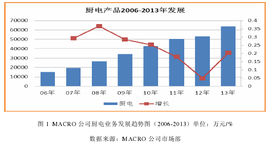 MACRO 是一家專業(yè)從事清潔能源(燃氣)高效利用,以產(chǎn)品和服務(wù)為核心價值的低碳、智慧型企業(yè)。公司成立于 1988 年,廚房及關(guān)聯(lián)產(chǎn)業(yè)(整套廚電、集成櫥柜、生活電器、空氣凈化器)作為其核心支柱產(chǎn)業(yè),為客戶提供廚房的產(chǎn)品及整體系統(tǒng)解決方案。 公司始終貫徹“技術(shù)領(lǐng)先戰(zhàn)略”,堅持以技術(shù)創(chuàng)新引領(lǐng)行業(yè)發(fā)展,積累了雄厚的技術(shù)實力。公司還作為企業(yè)代表,主導(dǎo)起草了近 50 項國家、行業(yè)、地方標(biāo)準(zhǔn),包括《家用燃氣灶具》國家標(biāo)準(zhǔn)、《中國菜廚電選擇標(biāo)準(zhǔn)》等行業(yè)標(biāo)準(zhǔn),推動了中國廚電技術(shù)的全面升級。 在集團“2020 年百億工程”戰(zhàn)略規(guī)劃的指引下,公司廚電價值主張“中國菜廚電專家”,市場定位做中高端廚電,以技術(shù)創(chuàng)新、產(chǎn)品結(jié)構(gòu)優(yōu)化為切入點,規(guī)劃廚電產(chǎn)品及技術(shù),穩(wěn)定質(zhì)量、提升工藝基礎(chǔ),以規(guī)劃和預(yù)算為核心工具,通過完善組織架構(gòu)、人員梯隊建設(shè)、提升隊伍能力,完成廚電業(yè)務(wù)戰(zhàn)略目標(biāo),實現(xiàn)公司廚電業(yè)務(wù)的跨越式發(fā)展,成為行業(yè)領(lǐng)先企業(yè)。 MACRO 公司廚電產(chǎn)品主營油煙機、灶具、消毒柜三大品類,近 10 年業(yè)務(wù)保持 20%以上平均增長(圖 1),銷售額和銷量市場占有率排名行業(yè) 5-6 位。