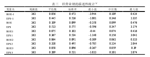 表三是對(duì)定向增發(fā)前一年至定向增發(fā)后三年公司的凈資產(chǎn)收益率和每股收益所作的描述性統(tǒng)計(jì),“ROE-1、ROE、ROE1、ROE2、ROE2、ROE3”分別代表定向增發(fā)前一年、當(dāng)年、后一年、后兩年、后三年的凈資產(chǎn)收益率;“EPS-1、EPS、EPS1、EPS2、EPS3” 分別代表定向增發(fā)前一年、當(dāng)年、后一年、后兩年、后三年的每股收益。由表可觀測(cè)出,代表公司經(jīng)營(yíng)業(yè)績(jī)的凈資產(chǎn)收益率及每股收益都在定向增發(fā)當(dāng)年達(dá)到最大值。在定向增發(fā)當(dāng)年公司的凈資產(chǎn)收益率均值達(dá)到 0.109,而每股收益達(dá)到 0.513。對(duì)于凈資產(chǎn)收益率這個(gè)變量來說,定向增發(fā)前其均值為 0.056,在定向增發(fā)當(dāng)年其均值達(dá)到最大后,隨后三年雖然均值較定向增發(fā)當(dāng)年有下降,但是不管是定向增發(fā)后第一年、第二年還是第三年,其均值均大于定向增發(fā)前一年的值。但是對(duì)于每股收益來說,其描述性統(tǒng)計(jì)的值恰恰相反。在定向增發(fā)前,平均每股收益為 0.445,在定向增發(fā)當(dāng)年達(dá)到 0.513的極大值后,公司的每股收益不斷下降,并且定向增發(fā)后三年的每股收益均是低于定向增發(fā)前的每股收益。