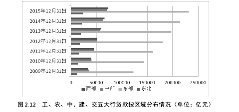本文選取的第二個(gè)角度是區(qū)域,分析五大行信貸資金的區(qū)域分布有助于了解其對(duì)各個(gè)區(qū)域不同的信貸投資力度,了解其信貸客戶的區(qū)域集中度等信息。作者結(jié)合行政區(qū)域的劃分以及各行年報(bào)的統(tǒng)計(jì)口徑,將我國(guó)境內(nèi)分為東北、東部、中部和西部四個(gè)區(qū)域,各個(gè)區(qū)域具體包含省份參見(jiàn)注釋。中部和西部地區(qū)的貸款余額占全部貸款余額的比重幾乎相當(dāng)。但從趨勢(shì)上來(lái)講,西部地區(qū)貸款余額的占比逐年提高,2015 年年末相比 2009 年年末增加了近 2 個(gè)百分點(diǎn);而中部地區(qū)每年年末貸款余額占全部貸款余額的比重浮動(dòng)微小,在選樣期間幾乎持平。截止到 2012 年 12 月 31 日,西部地區(qū)貸款余額首次超過(guò)中部地區(qū)貸款余額,成為占比第二高的區(qū)域。以上表明五大行的信貸資金流向中部和西部的份額相差不多,但近些年信貸結(jié)構(gòu)的調(diào)整方向更偏向于西部區(qū)域,西部地區(qū)貸款余額的增長(zhǎng)一直高于貸款余額的整體增長(zhǎng)水平。