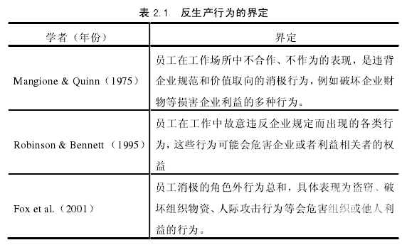 結合以往關于工作場所內越軌行為的研究結果,Mangione & Quinn 在1975 年首次明確提出了反生產(chǎn)行為(Counterproductive Workplace Behavior)的概念,并對其具體含義進行了嘗試性的界定。他們認為反生產(chǎn)行為主要是員工不合作、不作為的表現(xiàn),是員工違背企業(yè)規(guī)范和價值取向的系列消極行為,并且能夠對企業(yè)利益造成不同程度的損害。盡管這一概念提出較早,但直到上世紀九十年代,隨著員工在工作場所內負面行為日益嚴峻,反生產(chǎn)行為才開始得到學術界的廣泛關注。其中,Robinson & Bennett(1995)的界定得到后來許多學者的認可和肯定,他們將反生產(chǎn)行為定義為員工在工作場所中故意違反企業(yè)相關規(guī)范而出現(xiàn)的各類負面行為,這些行為可能會危害企業(yè)或者利益相關者的權益。該界定體現(xiàn)了反生產(chǎn)行為三方面的主要內涵:(1)該行為是員工主觀故意實施的;(2)該行為結果可能或者已經(jīng)為組織帶來利益損害;(3)盡管行為結果可能為組織帶來某些潛在利益,但仍不足以彌補給組織造成的危害(Sackett & Devore,2001)。 此后眾多學者對反生產(chǎn)行為進行了多種界定,但基本都涵蓋了以上三方面的特征(Bordia et al.,2008;王琛、陳維政,2009)。還有學者在對反生產(chǎn)行為與組織公民行為的比較基礎上,認為反生產(chǎn)行為實質上是員工消極的角色外行為總和,這些行為可能在組織中沒有明確指出是否可以執(zhí)行或禁止實施,其具體表現(xiàn)為怠工、盜竊、破壞組織物資、人際攻擊行為等會危害組織或他人利益的行為(Fox et al.,2001;張永軍等,2012)。我國學者基于中國本土化情境也對反生產(chǎn)行為進行了詳細研究與界定(張建衛(wèi)、劉玉新,2009;劉文彬,2015)。這些界定內容基本都體現(xiàn)了反生產(chǎn)行為的故意性、危害性、違規(guī)性,具體界定匯總如表 2.1 所示。