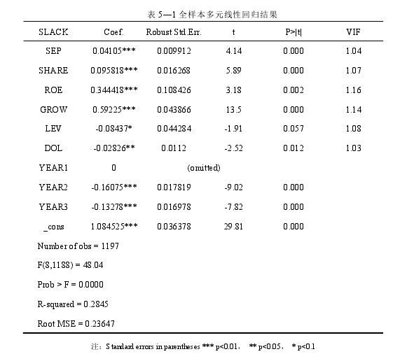 為驗(yàn)證假設(shè) 1,采用全樣本對(duì)模型進(jìn)行多元線性回歸分析的結(jié)果具體如下圖所示的表 5—1。 由表 5—1 可以看出,數(shù)據(jù)經(jīng)過篩選共有 1197 家符合要求,使用全樣本對(duì)模型回歸時(shí)該模型的 F 值為 48.04,在 1%的水平上顯著,R2為 0.2845,說明模型中各解釋變量和控制變量對(duì)被解釋變量預(yù)算松弛的解釋力較強(qiáng)。模型中各主要變量的方差膨脹因子系數(shù) VIF 均小于 2,這表明,在模型中各個(gè)主要解釋變量之間的相關(guān)性較小,變量之間不存在多重共線性,模型多元線性回歸分析的結(jié)果較為真實(shí)可靠。兩權(quán)分離 SEP 的回歸系數(shù)為 0.04105,且在 1%的水平上顯著正相關(guān),這代表在其他條件一定的情況下,兩權(quán)分離度越高預(yù)算松弛就越高,這與我們的假設(shè) 1 一致,即可驗(yàn)證假設(shè) 1??刂谱兞恐衅髽I(yè)性質(zhì) SHARE 這一變量回歸系數(shù)為 0.095818,在 1%的水平上顯著正相關(guān),也就是說,與非國(guó)有企業(yè)相比,國(guó)有企業(yè)的預(yù)算松弛會(huì)更大。這與之前眾多學(xué)者的研究是相同的。企業(yè)的凈資產(chǎn)收益率 ROE 與企業(yè)的成長(zhǎng)性 GROW 的回歸系數(shù)均為正且都與預(yù)算松弛在1%的水平上顯著。即企業(yè)業(yè)績(jī)?cè)胶没蚱髽I(yè)處在成長(zhǎng)階段時(shí),預(yù)算松弛會(huì)越大,這也是和之前學(xué)者研究的結(jié)論是相同的。企業(yè)的資產(chǎn)負(fù)債率 LEV 與企業(yè)的經(jīng)營(yíng)杠桿系數(shù) DOL的回歸系數(shù)均為負(fù),企業(yè)資產(chǎn)負(fù)債率 LEV 在 10%的水平上顯著,企業(yè)的經(jīng)營(yíng)杠桿系數(shù)在 5%的水平上顯著??梢哉f企業(yè)的資產(chǎn)負(fù)債率越高或者經(jīng)營(yíng)風(fēng)險(xiǎn)越高,預(yù)算松弛水平越低.