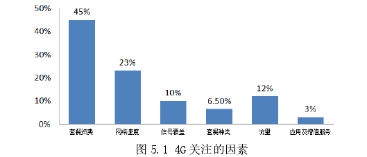 在當(dāng)下白熱化的市場(chǎng)競(jìng)爭(zhēng)環(huán)境下,通信行業(yè)早已從“賣方市場(chǎng)”轉(zhuǎn)變?yōu)?ldquo;買方市場(chǎng)”,因此,正確把握用戶的真實(shí)需求成為山西移動(dòng)獲取客戶價(jià)值,贏得勝利的關(guān)鍵所在[38]。基于此,本人在山西移動(dòng)的大力支持下,依托互聯(lián)網(wǎng)平臺(tái)、實(shí)體渠道進(jìn)行了為期三個(gè)月的 4G 業(yè)務(wù)用戶需求調(diào)查,通過對(duì)調(diào)查進(jìn)行綜合分析,發(fā)現(xiàn) 4G 時(shí)代用戶需求特征主要為:從圖 5.1 可知,在選擇 4G 時(shí),用戶所關(guān)注的因素中,45%的受訪者選擇了套餐資費(fèi),遠(yuǎn)高于其他因素。從圖 5.2 可知,在 4G 套餐資費(fèi)感受中,75%的受訪者認(rèn)為目前套餐價(jià)格仍然比較貴,僅有 20%的人認(rèn)為與原來 2G、3G 套餐資費(fèi)差不多。這表明雖然山西目前的經(jīng)濟(jì)形勢(shì)有所好轉(zhuǎn),但是人們對(duì) 4G 套餐的價(jià)格仍然比較敏感。過高的 4G 套餐資費(fèi)將嚴(yán)重影響 4G 業(yè)務(wù)的發(fā)展。在調(diào)查過程中,用戶還反映,移動(dòng)公司 4G 業(yè)務(wù)套餐設(shè)置不合理,語音、短信、流量搭配無法定制,不能滿足個(gè)性化需求。隨著智能手機(jī)的普及以及用途的擴(kuò)大,將會(huì)有越來越多的用戶對(duì)移動(dòng)產(chǎn)品的資費(fèi)和套餐搭配變得更加敏感。如何讓 4G 真正“進(jìn)入尋常百姓家”,使消費(fèi)者充分享受 4G 帶來的便利和迅速的同時(shí)不再擔(dān)心高額的費(fèi)用支出,速度與實(shí)惠是山西移動(dòng) 4G 時(shí)代的關(guān)鍵詞。