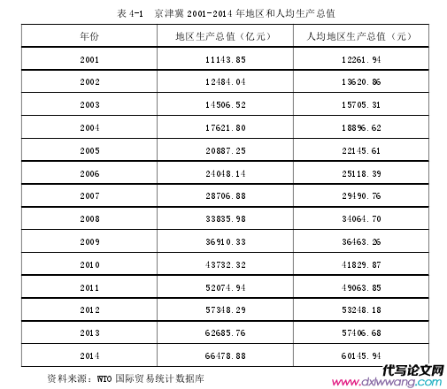 1970 年以前,服務(wù)貿(mào)易還沒有引起人們太多的關(guān)注,關(guān)貿(mào)總協(xié)定組織的多輪談判也都沒有考慮到要涉及這一議題。自 1970 年以后,其取得到了迅猛的發(fā)展,它的發(fā)展?jié)摿蛯σ粐虻貐^(qū)經(jīng)濟的發(fā)展的重要性才逐步引起人們關(guān)注,其在各國貿(mào)易中的占比也在不斷增加,并且成為當(dāng)代國際競爭重要內(nèi)容,其在世界市場中是否具有競爭力直接影響到一國或地區(qū)在世界競爭市場中的地位。隨著人們對服務(wù)貿(mào)易關(guān)注程度的不斷提高,它的經(jīng)濟地位日益加重。因此各國都積極發(fā)展本國的服務(wù)貿(mào)易,并融入國際市場,促進了世界服務(wù)貿(mào)易的進出口額的逐漸增長。其中,1980-2014 年進口額由 4036 億美元增長為 47405 億美元;出口總額則從 3671 億美元增長到 48615 億美元。與此同時,我國的服務(wù)貿(mào)易也在迅速成長,甚至貨物貿(mào)易增長的速度都不及它,它在世界的服務(wù)貿(mào)易中所占的比重也在不斷增加。其中從 1992-2014 年,服務(wù)貿(mào)易的進口額由 44 億美元增長為 3821 億美元,比重由 0.5%增長為 8.1%,約增長了 15 倍;同一時期,出口額從 25 億美元增長為 2222 億美元,比重由 0.7%增長到 4.6%,增長了將近 6 倍。而京津冀地區(qū)作為中國北方經(jīng)濟的增長極,工業(yè)化的發(fā)展對其起到了非常重要的作用。但在國家去除落后產(chǎn)能、提倡節(jié)約資源及減少污染物排放、減少霧霾的號召下,鋼鐵等資源性產(chǎn)品出口將受到很大影響,京津冀地區(qū)工業(yè)的發(fā)展呈現(xiàn)出不可持續(xù)性。因此,該地區(qū)將大力發(fā)展服務(wù)貿(mào)易作為一項重要任務(wù)。雖然,2001-2014年京津冀服務(wù)貿(mào)易的進出口額由157.02億美元增加到1364.6億美元,有顯著地增加。但是與長三角等區(qū)域的服務(wù)貿(mào)易還是有一定的差距。因此,該地區(qū)應(yīng)該尋找影響服務(wù)貿(mào)易的發(fā)展的因素,抓住對外開放這一機遇,積極發(fā)展服務(wù)貿(mào)易,并且利用京津冀在經(jīng)濟方面合作的契機,促進其服務(wù)貿(mào)易協(xié)同發(fā)展,從而提高競爭力的整體水平。
