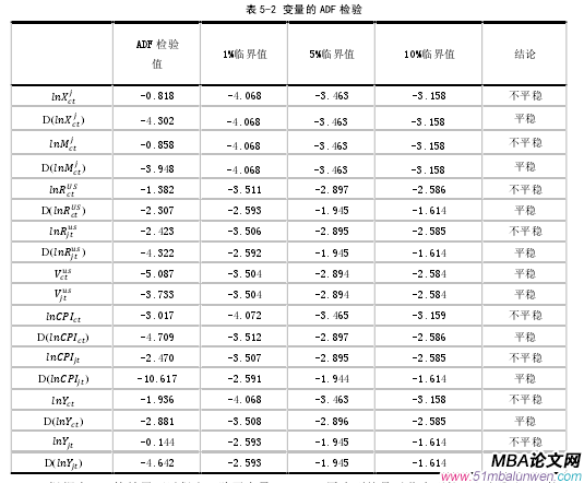 VAR 模型就是向量自回歸模型,很多學(xué)者在研究經(jīng)濟(jì)問題時(shí)習(xí)慣使用 VAR 模型。因?yàn)閂AR 模型研究的是不同變量之間的相關(guān)關(guān)系,他不需要復(fù)雜的理論基礎(chǔ)做支撐。具體來說,VAR 模型采取的是多方程聯(lián)立的形式,在模型的所有方程中,他將每一個(gè)變量都視為內(nèi)生變量處理,用內(nèi)生變量對自身模型的全部內(nèi)生變量的滯后值進(jìn)行回歸,從而可以更加清楚明了地估計(jì)匯率與進(jìn)出口貿(mào)易之間的動(dòng)態(tài)關(guān)系。而且因?yàn)?VAR 模型不受到經(jīng)濟(jì)理論基礎(chǔ)的束縛,對于解釋變量可以酌情增減,這也拓寬了學(xué)者的研究思路,使得實(shí)證研究更加的簡單易懂。引力模型作為經(jīng)驗(yàn)?zāi)P驮谧铋_始的時(shí)候并沒有強(qiáng)有力的理論依托,但是經(jīng)過二十多年的發(fā)展,學(xué)者發(fā)現(xiàn)了很多的理論框架為引力模型的推導(dǎo)打下了理論基礎(chǔ)。具體來說:基于自由市場的比較優(yōu)勢理論、基于壟斷競爭的新貿(mào)易理論和基于要素稟賦的 H-O 理論等貿(mào)易理論,都可以獨(dú)立推導(dǎo)出某種形式的引力方程。而本文的引力模型是建立在供求模型的微觀基礎(chǔ)上延伸出來的,這種方法在國內(nèi)外被大量學(xué)者使用。根據(jù)中日雙邊貿(mào)易的實(shí)際情況,本文在原有的引力模型基礎(chǔ)上也做了修正。由于媒介貨幣的引入,作者將不使用人民幣兌日元的直接匯率,而是將人民幣兌美元匯率、日元兌美元的匯率引入解釋變量中去,同時(shí)加入?yún)R率波動(dòng)率變量。再加入兩國的國民收入變量和人均國民收入變量,居民消費(fèi)價(jià)格指數(shù)變量。除此之外再引入我們前文提到的影響雙邊貿(mào)易的虛擬變量-匯率制度改革和加入 WTO。在這些變量的基礎(chǔ)上作者分別通過進(jìn)口和出口兩個(gè)模型分別進(jìn)行研究。當(dāng)然變量的增多可能導(dǎo)致完全共線性的問題,因此筆者將對數(shù)據(jù)進(jìn)行相關(guān)性分析,將具有完全共線性的變量剔除掉。在計(jì)量方面,作者選擇了最新的 Eviews7.2 的計(jì)量軟件進(jìn)行分析。先進(jìn)行平穩(wěn)性檢驗(yàn),時(shí)間序列數(shù)據(jù)一般存在不平穩(wěn)的現(xiàn)象。如果變量經(jīng)差分后可以達(dá)到同階單整,那么用 E-G 兩步法對變量進(jìn)行協(xié)整檢驗(yàn),觀察各個(gè)解釋變量對被解釋變量的影響程度。然后在協(xié)整的基礎(chǔ)上做出誤差修正模型,分析變量短期之間是否存在均衡關(guān)系。