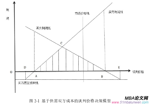 影響談判價格的因素有:供需雙方成本水平、市場價格水平、供給狀況、需求狀況等,其中最重要的因素是供需方成本。談判價格決策模型介紹了供需雙方各自的盈虧平衡點及如何實現(xiàn)供需雙方“共贏”的局面,為逆向定價模型的建立及逆向定價模型倡導(dǎo)的“共贏”與“可持續(xù)發(fā)展”提供了理論基礎(chǔ)?;诠┬桦p方成本考慮的價格決策模型建立過程如下:首先,估算買方的全成本。核算買方的制造成本、財務(wù)費用和附加稅。其次,估算賣方的全成本。前往供方現(xiàn)場進(jìn)行調(diào)查,一方面核實其生產(chǎn)及權(quán)證的真實性、合法性和有效性,另一方面,根據(jù)生產(chǎn)工藝、生產(chǎn)狀況、當(dāng)?shù)貏诠こ杀镜裙浪闫渲圃斐杀?。在分別估算了買方和賣方成本的前提下,根據(jù)現(xiàn)貨市場價格和價格走勢預(yù)測,測算出買賣雙方的利潤曲線,繪出談判價格決策模型,如圖 2-1 所示:由圖 2-1 所示,作為買方,隨著談判價格的上升,利潤空間呈下降趨勢。作為賣方,隨著談判價格的上升,利潤空間逐漸增加。兩條利潤線與談判價格線相交形成的區(qū)域為買賣雙方的利潤區(qū)間,即從 A 到 B 為買賣雙方價格談判區(qū)間。點 A 為賣方的價格接受下限,為賣方的盈虧平衡點。點 B 為買方的接受價格上限,為買方的盈虧平衡點。如果兩線不能相交與價格線形成一個區(qū)域,則買賣雙方不能實現(xiàn)雙贏,除非考慮非成本因素,否則談判成功的可能性微乎其微。賣方的成本加成法得出的價格,與買方成本加成法所得價格多大程度上取得一致,達(dá)到所謂“雙贏”,便形成了雙方都可接受的價格區(qū)間,在這個區(qū)間內(nèi)雙方價格達(dá)成一致,買賣方均有利可圖。但價格越接近 A 點,賣方利潤空間越小,越接近 B 點,買方利潤空間越小。在 AB 區(qū)間內(nèi),通過優(yōu)秀的采購經(jīng)理與供應(yīng)商的博弈,依據(jù)不同的市場競爭環(huán)境、供貨周期、供貨數(shù)量等因素,可以為采購方獲取更多的利潤空間。買賣雙方博弈,充分的談判準(zhǔn)備和技巧有助于爭取更多的利潤空間。