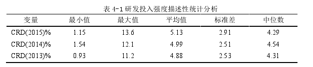 為了對(duì)所選 30 家企業(yè) 2013-2015 年研發(fā)投入情況有一個(gè)比較清晰直觀的了解,本文考察了其 3 年來(lái)平均數(shù)、極值等指標(biāo)的變化,結(jié)果如下表所示:由上表可知,河南省上市高新技術(shù)企業(yè)的研發(fā)投入強(qiáng)度在逐年穩(wěn)步提高,從2013 年的 4.88%上升到了 2015 年的 5.13%,增幅為 5.07%。增幅雖然不多,但是仍然是一個(gè)好的趨勢(shì)。我省企業(yè)逐步明白加大研發(fā)投入力度是十分必要的。近三年來(lái)企業(yè)研發(fā)投入強(qiáng)度最大值 13.6%,在我省經(jīng)濟(jì)相對(duì)落后的情況下,這已經(jīng)是一個(gè)很大的數(shù)值了。但是最小值只有 0.93%,個(gè)體企業(yè)間差距很大,國(guó)際上通常認(rèn)為低于 1%就是比較難以生存了。近三年來(lái)我省 30 家企業(yè)研發(fā)投入強(qiáng)度均值都在 5%左右,處在一個(gè)中等的水平,與國(guó)際上認(rèn)可的有競(jìng)爭(zhēng)力的 5%的水平近乎吻合。企業(yè)的 Tobin’s Q 值最低僅為 0.93,最高可以達(dá)到 8.472,相差 9 倍,企業(yè)投資回報(bào)率有很大的差距。從市場(chǎng)角度來(lái)看,有些企業(yè)被投資者看好,有些企業(yè)幾乎被市場(chǎng)遺忘。權(quán)益報(bào)酬率最高可以達(dá)到 14.35%,是最小值得 37 倍,猶如云泥之別。這說(shuō)明,30 家企業(yè)利用股東投入資本獲取利潤(rùn)的能力有較大的差別。資產(chǎn)負(fù)債率的平均值為 35.36%,并不是很高,意味著河南省上市高新技術(shù)企業(yè)整體負(fù)債水平適中,企業(yè)可以較好的發(fā)展下去。從企業(yè)性質(zhì)的均值為 0.233 可以看出,說(shuō)明河南省上市高新技術(shù)企業(yè)中以民營(yíng)企業(yè)為主,國(guó)有控股企業(yè)較少。從另一點(diǎn)也說(shuō)明了政府想要提高當(dāng)?shù)氐目蒲兴剑龠M(jìn)經(jīng)濟(jì)發(fā)展,應(yīng)該根據(jù)實(shí)際情況,加大力度扶持民營(yíng)高新技術(shù)企業(yè)。