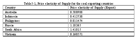 The elasticity of supply shows the degree of responsiveness of supply to pricechanges in the world market. Some countries have exhibited a higher elasticity thanothers, this is a common trend in all markets not only energy market.The Least Square Method of Linear Regression was employed to obtain theelasticity which in turn was used for calculating equilibrium values. Gretl softwarewas used to run the regression analysis.The table above indicates the elasticities for exports of coal. The positive valuesindicate that countries export more coal when the price goes up, this is a commonresult and it s in line with the prediction of the economic theory of demand and supply.Indonesia has an elasticity of 0.412738 indicating that for every 1 percent increase inprice of coal in the market, Indonesia tends to increase its export by 0.4. Increase inexport is not equal to price increase since there are many players in the market all ofwhich are fighting to increase their export as a result of price increase.