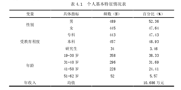 在有效樣本中,男性占總樣本的比例是 52.36%,女性占總樣本的比例是 47.64%,從接受教育的性別總體來看,樣本男女比例基本符合當(dāng)前我國高校中男女上學(xué)比例。為了更直觀的探討高等教育各層次的教育收益率,本文將高等教育的受教育層次分為???、本科和研究生,其中研究生包括碩士研究生和博士研究生,但是由于樣本量中沒有博士樣本,此處的研究生實際上只代表碩士研究生。研究對象中???、本科、研究生的比例分別 47.43%、48.93%、3.46%。近年來,我國研究生的招生規(guī)?;旧鲜菍1究普猩?guī)模的十分之一,此次研究對象專科、本科、研究生的比例基本符合目前高校各層次人數(shù)占比。從年齡狀況來看,本文分為四個年齡段,分為 19 歲-30 歲、31-40 歲、41-50歲、51-62 歲[25],分別占比 38.33%、31.69%、24.41%、5.57%。從收入上看,人均年收入為 10.686 萬元。如表 4.2 所示,家庭背景中,父親受教育程度總體偏低,占比最多的是高中為59.64%。由于我們總體樣本被調(diào)查者的年齡在 19 歲-62 歲,父輩的年代教育程度可能受教育水平和教育普及程度的影響,呈現(xiàn)總體偏低的情況。在父親工作職位一項中,一般人員的占比和一般干部的占比最多,分別為 63.38%和 29.12%。受調(diào)查者為農(nóng)業(yè)戶口的比重為 45.72%,非農(nóng)業(yè)戶口的比重為 54.28%。