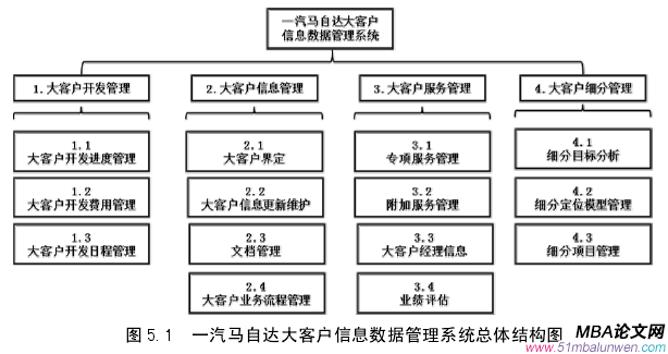 企業(yè)管理機(jī)制隨著大數(shù)據(jù)時(shí)代的帶來(lái)必須要進(jìn)行相應(yīng)的變革,對(duì)于企業(yè)來(lái)講,大客戶資源就是公司的金融資產(chǎn)。精準(zhǔn)識(shí)別大客戶并進(jìn)行科學(xué)的分析是企業(yè)做好大客戶營(yíng)銷(xiāo)的前提。通過(guò)收集客戶信息,對(duì)客戶的核心需求進(jìn)行準(zhǔn)確的分析和挖掘才能保證大客戶的開(kāi)發(fā)與維系的成功推進(jìn),而這一切都是以完善的大客戶信息為前提的。構(gòu)建大客戶信息數(shù)據(jù)管理系統(tǒng)的目的就是將線下的無(wú)序的、不規(guī)范的、隨機(jī)性的大客戶信息管理轉(zhuǎn)移到線上進(jìn)行有序的、規(guī)范的、及時(shí)性的信息管理。通過(guò)前文對(duì)于一汽馬自達(dá)大客戶管理工作現(xiàn)狀及未來(lái)的發(fā)展目標(biāo)的分析,可以得出一汽馬自達(dá)的大客戶信息數(shù)據(jù)管理系統(tǒng)需要實(shí)現(xiàn)的主要功能模塊,如圖 5.1 所示:由圖 3.1 一汽馬自達(dá)組織機(jī)構(gòu)圖可見(jiàn),大客戶經(jīng)理在目前公司所處的層級(jí)是非常之低的。但大客戶的需求往往又是非常高的,由于大客戶經(jīng)理的授權(quán)有限,無(wú)法第一時(shí)間同大客戶進(jìn)行對(duì)等的溝通與決策。按照現(xiàn)有的組織機(jī)構(gòu)與流程,大客戶經(jīng)理得到大客戶銷(xiāo)售機(jī)會(huì)時(shí)需要逐級(jí)上報(bào)審批;而當(dāng)大客戶主動(dòng)接洽公司高層時(shí),高層經(jīng)理人員則會(huì)將業(yè)務(wù)逐級(jí)下放,直至傳遞至大客戶經(jīng)理處,浪費(fèi)的大量的時(shí)間與精力。商場(chǎng)瞬息萬(wàn)變,機(jī)會(huì)轉(zhuǎn)瞬即逝,機(jī)構(gòu)的冗余和信息溝通不暢,往往因此錯(cuò)失銷(xiāo)售良機(jī)。