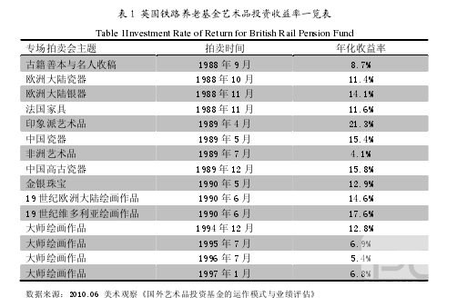 關(guān)于藝術(shù)品的投資價值一直是學(xué)術(shù)界爭論的焦點,由于藝術(shù)品交易信息不透明,且藝術(shù)品的收藏期限較長,故很難全面追溯藝術(shù)品的交易記錄來分析其收益率。自 20 世紀(jì) 70 年代至今,多位學(xué)者通過交易追溯的方法試圖建立有效的樣本集合,從而分析藝術(shù)品投資價值。但由于樣本量不充分及樣本選擇偏差等原因,各位學(xué)者得出的結(jié)論迥然不同:有的認(rèn)為藝術(shù)品沒有投資價值,從長期來看其收益率低于國債;有的則認(rèn)為藝術(shù)品具有較高的投資價值,其收益率高于債券甚至股票。然而,隨著藝術(shù)品交易市場的不斷規(guī)范,拍賣行的交易記錄逐步完善,藝術(shù)品投資的研究數(shù)據(jù)越來越全面,各種藝術(shù)品指數(shù)相繼出現(xiàn),使得藝術(shù)品的價值研究更有說服力。因此,本文將以實例說明和指數(shù)分析相結(jié)合的方法研究藝術(shù)品的投資價值。 回顧藝術(shù)品投資歷史,英國鐵路養(yǎng)老基金的成功一直為收藏界津津樂道。從其公布的英國鐵路養(yǎng)老基金藝術(shù)品專場拍賣會收益率數(shù)據(jù)來看(如表 1 所示),英國鐵路養(yǎng)老基金投資組合的平均年收益率約為 13%,其中印象派藝術(shù)品、中國瓷器、中國高古瓷器以及 19 世紀(jì)維多利亞繪畫作品的年化收益率超過 15%,投資回報最差的非洲藝術(shù)品也有 4.1%的年化收益率。除英國鐵路養(yǎng)老基金外,由佳士得拍賣行前任財務(wù)經(jīng)理菲利普 霍夫曼創(chuàng)建的英國美術(shù)管理服務(wù)有限公司也有不俗的業(yè)績。2003 年至 2007 年,英國美術(shù)管理公司旗下的美術(shù)基金平均收益率高達(dá) 50%。但另一方面,慘遭滑鐵盧的藝術(shù)品投資基金也不在少數(shù)。1989 年,大通藝術(shù)基金(首支在金融界建立的藝術(shù)品投資基金)通過巴黎銀行基金投資 2200 萬美元,購買 16 幅法國及意大利的繪畫及素描作品。但由于收藏成本過高;藝術(shù)品價格下滑等原因,7 年后基金退出時損失高達(dá) 800 萬美元(約為初始投資金額的 40%)。此外,投資失敗的案例還包括 Morgan Grenfell 發(fā)售的 2500 萬美元的藝術(shù)品投資基金,日本 Itoman Mortgage Corporation 投資 5.2 億美元購買的 7300 件西方現(xiàn)代主義及印象派的繪畫作品等。由此可見,藝術(shù)品雖然具有很高的投資價值,但同時伴隨明顯的投資風(fēng)險,歷史經(jīng)驗表明藝術(shù)品投資收益率有很大的波動性。