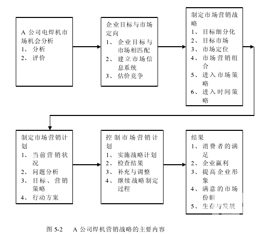 營銷戰(zhàn)略,是企業(yè)為實現(xiàn)各種特定的營銷目標(biāo)[1]。實現(xiàn)自身生存和發(fā)展而選擇和制定的行為綱領(lǐng)或方案。如何讓企業(yè)利潤增加,擴(kuò)大市場份額,這就必須要實施科學(xué)的營銷戰(zhàn)略。整合 A 公司焊機(jī)市場營銷管理過程(見圖 5-1)是一個業(yè)務(wù)戰(zhàn)略過程,它的制定、執(zhí)行是可評價協(xié)調(diào)和可測度的。A 公司電焊機(jī)具體的營銷戰(zhàn)略可以用以下表現(xiàn)(見圖 5-2),它表明了市場營銷過程中復(fù)雜變量間的關(guān)系。 市場營銷策略是一個企業(yè)市場營銷戰(zhàn)略的核心部分,企業(yè)應(yīng)隨時調(diào)整營銷組合因素,各種因素協(xié)調(diào)配合、采取協(xié)調(diào)一致的行動,才能發(fā)揮整體功能。在做出準(zhǔn)確有市場定位之后,下面針對 A 公司營銷策略中產(chǎn)品、價格、促銷、渠道中存在的問題進(jìn)行研究,對 A 公司營銷策略進(jìn)行優(yōu)化。