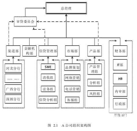小額貸款A(yù)公司成立于2003年,是一家專門為個人、工商個體戶和小企業(yè)主提供免抵押免擔保、快速簡便的小額貸款咨詢服務(wù)的企業(yè)。屬于中國小額貸款行業(yè)的龍頭企業(yè)。目前在深圳、北京、河北、福建、四川、浙江等地有52家營業(yè)網(wǎng)點,千余名員工專門從事小額貸款業(yè)務(wù)。 A 公司目前共設(shè)十個部門:渠道部,財務(wù)部,IT 部,HR 部,市場部,金融機構(gòu)部,產(chǎn)品部,行政部,人力資源部,信貸管理部;組織架構(gòu)如圖 2.1:為上班族量身打造的快速簡便的小額貸款服務(wù)。申請條件為:20-60 周歲,中國大陸戶口的合法公民;在公司網(wǎng)點所在地居住或工作;現(xiàn)職工作持續(xù) 4 個月以上;月收入 2000 元以上(不同地區(qū)的收入標準可能相應(yīng)調(diào)整)。貸款期限可選擇 12、18、24、30、36 個月.貸款額度最高 30 萬,每月等本等息還款。為微小企業(yè)主提供快速簡便的小額貸款服務(wù)。申請條件為:20-65 周歲,中國大陸戶口的合法公民;在公司營業(yè)網(wǎng)點所在地居住或經(jīng)營;生意經(jīng)營時間持續(xù) 6個月以上(部分行業(yè)可持續(xù)經(jīng)營 3 個月以上)。貸款期限 6-24 個月可靈活選擇。貸款額度最高 50 萬,每月等本等息還款。