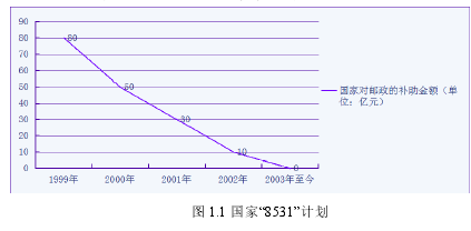 在 1998 年郵政拆分以前,中國郵政的傳統(tǒng)經(jīng)營項目主要是一些勞動密集型的函件、報刊發(fā)行等業(yè)務(wù)。這種業(yè)務(wù)的特點是業(yè)務(wù)收入較低。主營業(yè)務(wù)收入低的同時,郵政同時還在承擔(dān)著國家普遍服務(wù)的功能。巨大的壓力下,我國郵政一直處于嚴(yán)重的虧損狀態(tài),上個世紀(jì)末,中國郵政總公司虧損總額上百億。針對郵政的現(xiàn)實困難國家特別推出了一個扶持郵政的計劃,即“8531”計劃。這個計劃是:在 1999 年國家補貼郵政 80 億元,2000 年國家補助郵政 50 億元,2001年國家補助郵政 30 億元,2002 年國家補助郵政 10 億元,從 2003 年起,國家對郵政不再進行補助,中國郵政進入自主盈虧的階段。如圖 1.1 所示。