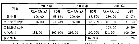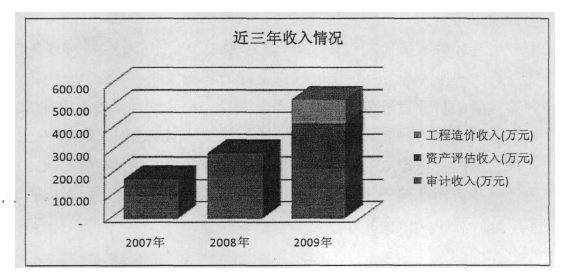 A事務所成立之初以審計為主要業(yè)務,然而隨著近幾年事務所將業(yè)務范圍不斷橫向延伸,2007年增加了評估業(yè)務,2009年增加了工程造價咨詢業(yè)務,A事務所出現(xiàn)了高速發(fā)展的趨勢,近三年事務所的收入情況如下: