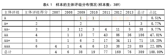本文以 2007 年至 2013 年 09 月我國債券市場發(fā)行的公司債為樣本,剔除掉一些數(shù)據(jù)不全、數(shù)據(jù)異常的樣本,剩余 389 個公司債樣本。本文采用 Ordinal 模型實證分析了公司財務(wù)風險對信用評級的影響,包括公司債債主體等級和債券信用等級,為了檢驗 Ordinal 模型的實證結(jié)果,也用二元 Logistic 模型進行穩(wěn)健性檢驗,研究的發(fā)現(xiàn)主要有: