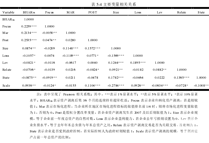 表 5-4 是本文研究的主要變量的相關(guān)系數(shù)矩陣表。各個(gè)變量與因變量企業(yè)價(jià)值BHAR36之間存在顯著的相關(guān)性。歸核化資產(chǎn)剝離與企業(yè)績(jī)效的相關(guān)性系數(shù)為0.2259,兩者在 1%的水平上顯著正相關(guān),說明歸核化資產(chǎn)剝離有助于創(chuàng)造企業(yè)價(jià)值,與學(xué)者 Chun Yu Mak(2014)、付彥等(2015)的研究結(jié)論一致;市場(chǎng)化程度和企業(yè)剝離價(jià)值效應(yīng)的相關(guān)系數(shù)為 0.2134,兩者在 1%的水平上顯著正相關(guān),說明橫向區(qū)域制度環(huán)境的改善有助于提高公司的剝離績(jī)效,初步驗(yàn)證了假設(shè) 2a;股權(quán)分置改革和企業(yè)剝離績(jī)效的相關(guān)系數(shù)為0.2535,兩者在1%的水平上顯著正相關(guān),說明縱向制度環(huán)境的變遷對(duì)公司剝離績(jī)效的創(chuàng)造起正向促進(jìn)作用,同樣初步驗(yàn)證了假設(shè) 2b。此外,模型中的其余的控制變量與企業(yè)剝離績(jī)效的相關(guān)系數(shù)均十分顯著,表明本文在研究中控制的這些變量的影響具有必要性。