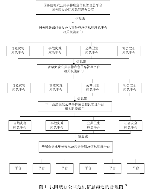 ?上圖顯示了我國(guó)的公共危機(jī)溝通呈現(xiàn)層級(jí)式,已形成國(guó)家、省級(jí)和市縣級(jí)三級(jí)溝通平臺(tái)。國(guó)務(wù)院是我國(guó)突發(fā)公共事件應(yīng)急管理中心平臺(tái)的核心機(jī)構(gòu),負(fù)責(zé)統(tǒng)領(lǐng)全國(guó)的公共危機(jī)管理工作。國(guó)務(wù)院又分別設(shè)立了應(yīng)對(duì)公共危機(jī)的相關(guān)職能部門,有自然災(zāi)害應(yīng)急管理平臺(tái)、事故災(zāi)難應(yīng)急管理平臺(tái)、公共衛(wèi)生應(yīng)急管理平臺(tái)、社會(huì)安全應(yīng)急管理平臺(tái)。省級(jí)政府根據(jù)國(guó)務(wù)院設(shè)立的突發(fā)公共事件應(yīng)急管理中心平臺(tái),又設(shè)立了省一級(jí)的應(yīng)對(duì)公共危機(jī)的相關(guān)職能部門,四個(gè)平臺(tái)也和國(guó)務(wù)院的一樣。市、縣級(jí)政府又根據(jù)省級(jí)政府的模式設(shè)立了市、縣一級(jí)的四個(gè)應(yīng)急平臺(tái)。從而形成了現(xiàn)在的公共危機(jī)溝通的“縱向集權(quán)式”管理流程模式。這種公共危機(jī)溝通的“縱向集權(quán)式”管理模式,明確規(guī)定了各級(jí)政府和各職能部門在公共危機(jī)管理中的權(quán)力及相關(guān)職責(zé),由國(guó)務(wù)院統(tǒng)領(lǐng)全國(guó)的公共危機(jī)管理工作,地方各級(jí)政府做好分工合作,充分發(fā)揮了集中領(lǐng)導(dǎo)的優(yōu)勢(shì),有利于加快危機(jī)信息的傳播,有利于保證危機(jī)溝通渠道的暢通,提升政府的公共危機(jī)管理能力。