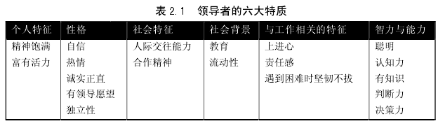 盡管如此,還有一些人堅持領導特質研究。例如,1991 年,Krikpatrick 和 Locke結合 Stogdill 的研究,提出領導者區(qū)別于非領導者的六大特質(個人特征、性格、社會特征、社會背景、與工作相關的特征、智力與能力)③,如表 2.1。此外,近年來對情商(Emotional Intelligence,簡稱 EQ)的研究也顯示了領導特質理論依然還受到學者的關注。
