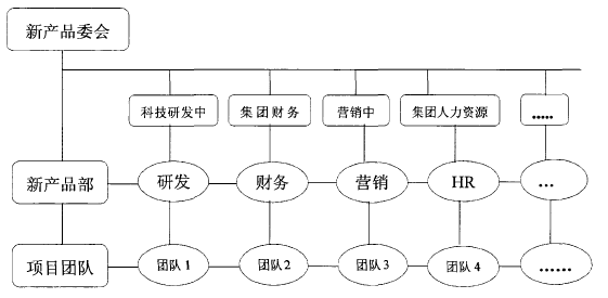 華羚集團(tuán)為了保證實現(xiàn)突破發(fā)展瓶頸的經(jīng)營目標(biāo),為藏地益寶蛋白質(zhì)粉的開發(fā)上市建立了專門的新產(chǎn)品開發(fā)組織,該組織屬于矩陣式組織結(jié)構(gòu),主要包括新產(chǎn)品委員會、新產(chǎn)品部和項目團(tuán)隊,各部門的成員是由集團(tuán)各職能部門抽調(diào)的員工,上至高層管理者,下至基層生產(chǎn)工人,組成新的組織為藏地益寶開發(fā)上市服務(wù)。具體組織結(jié)構(gòu)圖如下: