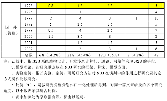 表 1-1是 1995 年到 2002 年國內(nèi)外關(guān)于NSS研究成果的對比表,客觀反映了NSS的研究現(xiàn)狀及發(fā)展方向。