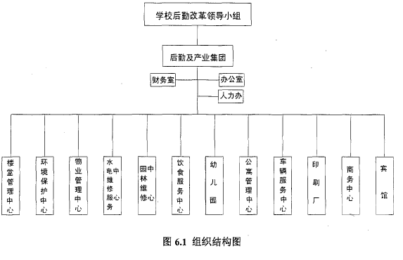 X大學(xué)是四川省重點(diǎn)建設(shè)的師范大學(xué),己有六十余年辦學(xué)歷史。校園占地面積2476畝,建筑面積91.9萬(wàn)平方米,學(xué)?,F(xiàn)有在職教職工2054人,在校全日制本專(zhuān)科學(xué)生、研究生和外國(guó)留學(xué)生30343人。2000年,為貫徹落實(shí)教育部《關(guān)于進(jìn)一步加快高等學(xué)校后勤社會(huì)化改進(jìn)的意見(jiàn)》,X大學(xué)在全省率先進(jìn)行了后勤社會(huì)化改革,將原總務(wù)處整體剝離組建了后勤服務(wù)總公司;2003年,又將后勤服務(wù)總公司、科技開(kāi)發(fā)總公司、校醫(yī)院合并組建成后勤及產(chǎn)業(yè)集團(tuán)。2007年6月,校醫(yī)院從后勤及產(chǎn)業(yè)集團(tuán)分離,成為學(xué)校的一個(gè)行政部門(mén)?,F(xiàn)在集團(tuán)下設(shè)十四個(gè)科級(jí)建制單位,現(xiàn)有職工800余人,擔(dān)負(fù)著學(xué)校三萬(wàn)余名師生員工的后勤保障工作,其組織結(jié)構(gòu)圖如6一1所示:?
