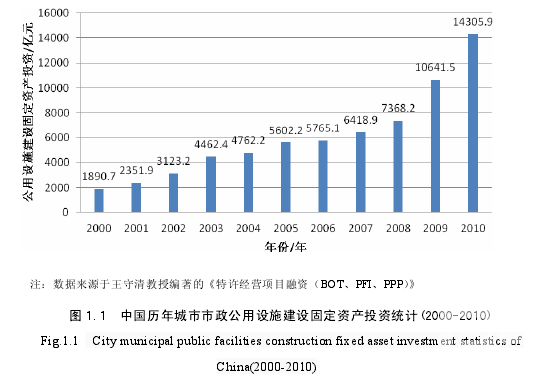 ?統(tǒng)計(jì)資料表明,2000 年至 2010 年以來,我國城市市政公用基礎(chǔ)設(shè)施投資額逐年增加,固定資產(chǎn)投資在 2010 年達(dá)到 14305.9 億元,近幾年上升速度有加大的趨勢(如圖?1.1 所示)。