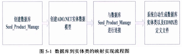 ?種子生產(chǎn)流程信息管理系統(tǒng)涉及到數(shù)據(jù)的錄入、修改、查詢、刪除等操作,這些操作都需耍通過訪問數(shù)據(jù)庫來實(shí)現(xiàn),而一般系統(tǒng)中數(shù)據(jù)庫的存取主要依靠的是創(chuàng)建連接,取數(shù)據(jù),將數(shù)據(jù)保存到自己創(chuàng)建的類中這樣一系列的流程,但是本系統(tǒng)采用了EF實(shí)體架構(gòu)的思想。從數(shù)據(jù)庫映射到實(shí)體類的工作流程圖如圖5-1所示。