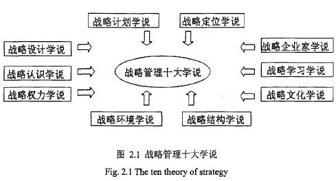 在近代,西方國家的戰(zhàn)略管理相關(guān)理論十分豐富,比如錢德勒的《戰(zhàn)略與結(jié)構(gòu)》所代表的戰(zhàn)略設(shè)計(jì)學(xué)說,將戰(zhàn)略形成看作一個(gè)概念作用的過程,認(rèn)為戰(zhàn)略能夠提高競(jìng)爭(zhēng)優(yōu)勢(shì);比如查理林德布羅姆所代表的戰(zhàn)略學(xué)習(xí)學(xué)說,認(rèn)為戰(zhàn)略是一個(gè)應(yīng)急的過程,戰(zhàn)略管理不僅是對(duì)變化的管理,也是通過變化來進(jìn)行管理,認(rèn)為戰(zhàn)略決定企業(yè)的發(fā)展命運(yùn),而學(xué)習(xí)能力來決定企業(yè)的戰(zhàn)略等。在1998年出版的著作《戰(zhàn)略歷程》中,美國著名管理學(xué)家亨利明茨伯格對(duì)西方國家在戰(zhàn)略的學(xué)說方面進(jìn)行了分析,并將這些學(xué)說進(jìn)行了分類,歸納為"十大戰(zhàn)略學(xué)說"(如圖2.1):設(shè)計(jì)學(xué)說、計(jì)劃學(xué)說、定位學(xué)說、企業(yè)家學(xué)說、認(rèn)識(shí)學(xué)說、學(xué)習(xí)學(xué)說、權(quán)力學(xué)說、文化學(xué)說、環(huán)境學(xué)說和結(jié)構(gòu)學(xué)說。