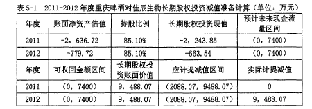 1998年,重慶啤酒欲要拓展業(yè)務(wù)范圍,將目光瞄準(zhǔn)了乙肝疫苗行業(yè)(合成肽乙肝疫苗)》當(dāng)年8月,與重慶第三軍醫(yī)大學(xué)共同出資設(shè)立了重慶佳辰生物工程有限公司(下稱“佳辰生物”)。佳辰生物其實自成立起就肩負(fù)著母公司重慶啤酒進(jìn)軍疫苗行業(yè)的使命,可以說是“為研發(fā)治療用乙肝疫苗而生”。雖然主營業(yè)務(wù)涵蓋生物制品、化學(xué)藥品的幵發(fā)研究,但隨著乙肝疫苗研發(fā)將近失敗的消息頻出,佳辰生物一直處于被投入而不盈利的財務(wù)狀態(tài)。這與當(dāng)時重慶啤酒預(yù)估的經(jīng)濟(jì)效益相差甚遠(yuǎn),而重慶啤酒對佳辰生物的巨額投資,也將付之東流。重慶啤酒在2009年贈予股份后,持有的佳辰生物股權(quán)份額從93%下降至85.1%,但該項長期股權(quán)投資仍能達(dá)到對被投資單位實施控制。2011年末,佳辰生物的賬面凈資產(chǎn)估值為-0.26億元。重慶啤酒對佳辰生物的長期股權(quán)投資現(xiàn)值為-0.22億元。由于佳辰生物為非上市公司,對其財務(wù)數(shù)據(jù)主要通過計算和推測,2005年,重慶啤酒將持有的8%佳辰生物股權(quán)獎勵給吳玉章和邊疆。2009年,佳辰生物與授予人簽署的股權(quán)轉(zhuǎn)讓協(xié)議顯示,兩人獲得總計8%的股權(quán),金額為696萬元。由此推算,2009年佳辰生物所有者權(quán)益的公允價值為0.87億元,則當(dāng)年重慶啤酒的長期股權(quán)投資賬面價值約為0.74億元。但2009年正是疫苗研制如火如荼進(jìn)行的階段,2011年研發(fā)失敗后,該長期股權(quán)投資賬面價值和未來現(xiàn)金流量必然低于0.74億元(表5-1)。