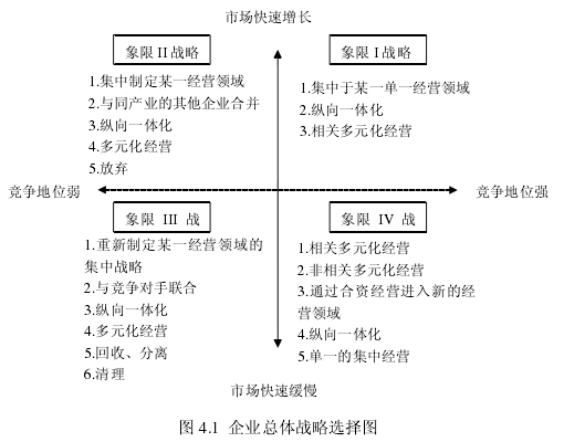 投資戰(zhàn)略是企業(yè)戰(zhàn)略管理的重要部分,其選擇與實施需要與企業(yè)戰(zhàn)略目標一致,并支持企業(yè)總體戰(zhàn)略的選擇。企業(yè)投資戰(zhàn)略是企業(yè)總體戰(zhàn)略中較高層次的綜合性子戰(zhàn)略。企業(yè)總體戰(zhàn)略主要分為發(fā)展戰(zhàn)略、穩(wěn)定戰(zhàn)略和收縮戰(zhàn)略。相應地,企業(yè)投資戰(zhàn)略也可劃分為發(fā)展型投資戰(zhàn)略、穩(wěn)定型投資戰(zhàn)略以及收縮型投資戰(zhàn)略。美國學者格魯克經(jīng)過 45 年對 358 位經(jīng)理的戰(zhàn)略選擇進行詳細分析后指出,選擇發(fā)展戰(zhàn)略的企業(yè)超過研究對象的半數(shù),只有不到 8%的企業(yè)選擇收縮戰(zhàn)略。此外,還有近 30%的企業(yè)選擇綜合型或其他戰(zhàn)略。本論文在第三章中已經(jīng)對華盛天誠醫(yī)院管理公司的宏觀環(huán)境及微觀環(huán)境進行了分析,此處可以利用企業(yè)總體戰(zhàn)略選擇圖,選擇“市場迅速增長”、“競爭地位”兩個維度輔助企業(yè)總體戰(zhàn)略的選擇。根據(jù)前文的分析,華盛天誠醫(yī)院管理公司目前所處環(huán)境市場增長迅速,但是公司自身的市場競爭能力不強,市場占有率較低。因此可以判斷,華盛天誠醫(yī)院管理公司的總體戰(zhàn)略目標選擇應該偏向第二象限,或者可以在第 I 和 II 象限交接的位置,即公司可以選擇集中戰(zhàn)略或者一體化戰(zhàn)略,以及多元化戰(zhàn)略。一體化戰(zhàn)略是企業(yè)沿著經(jīng)營鏈條縱向或者橫向的擴展業(yè)務的深度和廣度??v向一體化戰(zhàn)略是企業(yè)通過向上、下游擴展業(yè)務而節(jié)約交易成本,控制稀缺資源,保證關鍵投入的質量以及獲得新客戶等。一體化戰(zhàn)略通常適合上、下產(chǎn)業(yè)的增長潛力較大,利潤率較高;與上、下游交易成本較高的企業(yè)。此外,企業(yè)還要具備一體化戰(zhàn)略所需的資金、人力資源等。華盛天誠醫(yī)院管理公司所處的行業(yè)其上游供應商主要是藥品、器械、設備等生產(chǎn)企業(yè)。該上游行業(yè)競爭激烈,議價能力較差。華盛天誠醫(yī)院管理公司雖然可以通過并購等方式實現(xiàn)縱向一體化,但并不是最佳選擇。一方面,上游行業(yè)競爭激烈,可獲利水平一般,另一方面,前向一體化戰(zhàn)略可能占用公司大量的資金和人力、物力,增加資產(chǎn)的專用性,增加企業(yè)的退出成本;同時公司要面臨不熟悉新業(yè)務的風險。其下游客戶基本為普通患者,議價能力低,不具有后項一體化的必要性。