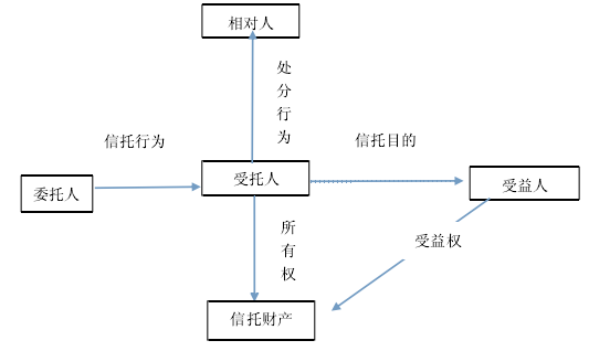 信托在不同的法律體系、不同的國家具有不同的詮釋。1我國現(xiàn)行《信托法》第 2 條規(guī)定:“信托是指委托人基于對受托人的信任,將其財產(chǎn)委托給受托人,由受托人按委托人的意愿以自己的名義,為受益人的利益或者特定目的,進(jìn)行管理或者處分的行為。”據(jù)此,揭示了我國信托四個方面的基本內(nèi)涵:一是信托以信任為基礎(chǔ)。在信托法律關(guān)系中,委托人基于對受托人的信任交付財產(chǎn),受托人對受益人負(fù)有信任責(zé)任;二是信托以財產(chǎn)為前提。信托是以財產(chǎn)為前提的一種制度安排,無財產(chǎn)便無信托。信托關(guān)系中必須存在財產(chǎn)權(quán)的轉(zhuǎn)移和分離;三是信托以受托人為核心。這是信托之核心。在信托制度中受托人是以“信托財產(chǎn)所有權(quán)人”的身份和名義履行受托職責(zé)的,信托的功能和目的完全依賴受托人的行為而得以實現(xiàn);四是信托以委托人意愿為目的。創(chuàng)設(shè)信托制度的目的是為了實現(xiàn)委托人的意愿,使受益人獲取利益或?qū)崿F(xiàn)其他目的。我國關(guān)于信托的法律定義,除了揭示了信托的基本法律內(nèi)涵外,也解釋了信托的基本法律構(gòu)造要素。從信托的定義看,其法律構(gòu)造可圖示如下: