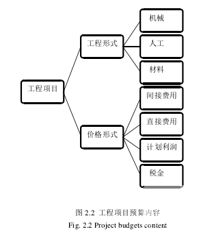 在一般的企業(yè)中,首先是簽訂合同,委托方以認為合理的價格選定施工方,施工方在保證工程順利完工的基礎上讓自己獲得合理的利益。施工方在做項目預算時,必須要知道具體施工過程,算出合理的資金需求量,同時也要制定出如何分配所得資金,如何有效的利用這筆資金,使資金實現(xiàn)最大效益。在施工過程中要保證既不會造成資金鏈的中斷,也不能預留過多的資金。 工程項目是一個復雜的系統(tǒng),為了使施工企業(yè)預算方便,可將項目工程預算的內(nèi)容大致分為兩中形式,如圖 2.2 所示。預算書中分別以工程形式和價格形式表現(xiàn)出具體的工程量與價值。以工程形式來劃分,其中,機械費用主要包括在施工的過程中,設備租賃費、消耗費、修理費、施工機械的進出場費、轉(zhuǎn)移費以及裝卸費。人工費主要包括不同工種的工人價格以及參與項目人員的獎金、津貼等。材料費用包括實際工作中所需要的原材料、零件、配件、半成品以及運輸與存儲、消耗的費用。 如果以價格形式表現(xiàn),那么工程項目的成本可以分為固定費用和可變費用。企業(yè)的管理費用、固定資產(chǎn)折舊費以及職工的培訓費等,這樣不會隨著工程量的增加而增加的資金叫做固定成本。相反的,隨著工程量的增加而增加的成本叫做可變成本,它主要有材料、現(xiàn)場經(jīng)費、臨時設施費、財務費用、冬、雨季施工增加費、夜間施工增加費、所得稅、特殊地區(qū)施工津貼費等。