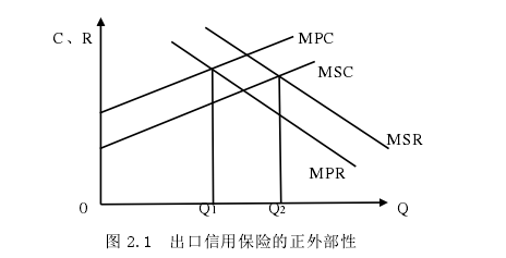 對(duì)外部性理論的定義,現(xiàn)在還沒(méi)有統(tǒng)一說(shuō)法,經(jīng)濟(jì)學(xué)家們主要從產(chǎn)生主體和接受主體這兩個(gè)角度對(duì)外部性進(jìn)行定義。出口信用保險(xiǎn)可以幫助投保企業(yè)保障風(fēng)險(xiǎn)、降低損失、獲得利益,同時(shí)出口信用保險(xiǎn)還可以促進(jìn)整個(gè)國(guó)民經(jīng)濟(jì)發(fā)展,增加就業(yè),整個(gè)社會(huì)都會(huì)從出口信用保險(xiǎn)中受益。所以,正外部性是出口信用保險(xiǎn)的一大特征。具體體現(xiàn)為出口企業(yè)投保出口信用保險(xiǎn)得到的受益比出口信用保險(xiǎn)為整個(gè)社會(huì)帶來(lái)的受益要小,另一方面,針對(duì)經(jīng)營(yíng)管理出口信用保險(xiǎn)的機(jī)構(gòu)來(lái)說(shuō),由于賠付率較高,保險(xiǎn)機(jī)構(gòu)付出的成本高于其所得受益。所以,出口信用保險(xiǎn)在不僅在需求方面存在正外部性,而且在供給方面也存在正外部性。出口信用保險(xiǎn)在需求和供給兩個(gè)方面的正外部性分別導(dǎo)致了有效需求和有效供給不足。 從圖 2.1 中我們可以分析出,在出口企業(yè)購(gòu)買出口信用保險(xiǎn)時(shí),出口企業(yè)得到的受益為 MPR,付出的邊際成本為 MPC,社會(huì)從中得到的邊際受益為 MSR,社會(huì)付出的邊際成本為 MSC,比較看出個(gè)人邊際受益小于社會(huì)邊際受益,個(gè)人邊際成本大于社會(huì)邊際成本。市場(chǎng)均衡時(shí) MR=MC,我們可以得出,出口企業(yè)消費(fèi)出口信用保險(xiǎn)的均衡量為 Q1,而社會(huì)的均衡產(chǎn)量為 Q2,Q1