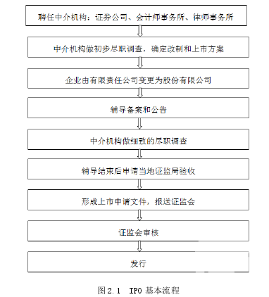 首次公開募股(Initial Public Offerings,簡稱 IPO):指股份制公司第一次的、向社會公眾公開的出售股份,從而籌集資金的發(fā)行形式。IPO 大致的流程如下圖所示:IPO 基本流程說明:第一步是由擬上市公司邀請中介服務(wù)機(jī)構(gòu)擔(dān)任職務(wù)——證券公司(俗稱“券商”)、會計(jì)師事務(wù)所以及律師事務(wù)所,它們的職責(zé)分工是這樣的——其中券商的任務(wù)是擔(dān)保、推薦、銷售,會計(jì)師事務(wù)所的工作是進(jìn)行相關(guān)審計(jì)業(yè)務(wù),律師事務(wù)所擔(dān)負(fù)著上市過程中所涉及到的法律問題;接著中介機(jī)構(gòu)在公司的合作下對公司的文檔資料、任職人員背景材料、所面臨的各類風(fēng)險(xiǎn)等做初步盡職調(diào)查并且確定改制和上市方案;接著由有限責(zé)任公司改變體制成股份有限公司;與券商簽訂輔導(dǎo)協(xié)議后去所在地的證監(jiān)局進(jìn)行存檔備查,接著在所在地登報(bào)公開接受輔導(dǎo)的備查檔案;中介機(jī)構(gòu)進(jìn)場做細(xì)致的盡職調(diào)查,對公司的各個(gè)方面進(jìn)行調(diào)查,發(fā)現(xiàn)存在的不規(guī)范的方面,提出整改建議,直到向證監(jiān)會報(bào)送上市申報(bào)材料;待輔導(dǎo)結(jié)束后就可以申請當(dāng)?shù)刈C監(jiān)局按照一定的標(biāo)準(zhǔn)進(jìn)行檢驗(yàn)采納;在盡職調(diào)查后形成上市申請文件,主要是招股說明書等,報(bào)送中國證監(jiān)會;之后由證監(jiān)會以一定的流程對文件資料進(jìn)行審查核實(shí),審核的過程是復(fù)雜而有序的,分別由不同處室在相互協(xié)調(diào)和相互制約的基礎(chǔ)上完成的,如果證監(jiān)會審核不通過,則不可以發(fā)行股票;審核通過后進(jìn)行首次公開發(fā)行。