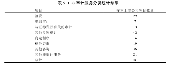 本文首先對樣本上市公司購買的非審計服務(wù)的類型進行了統(tǒng)計。非審計服務(wù)中除財務(wù)報表審計和內(nèi)控審計以外的鑒證服務(wù)包括:驗資、重組審計、與證券發(fā)行有關(guān)的審計服務(wù)以及其他專項審計服務(wù),非鑒證服務(wù)包括:商定程序、稅務(wù)咨詢、內(nèi)控咨詢等其他咨詢以及其他非鑒證業(yè)務(wù)。由上表可以看出,在鑒證業(yè)務(wù)中,樣本上市公司購買注冊會計師驗資服務(wù)的數(shù)量較多,另外其他專項審計項目數(shù)量較多,由于許多公司只披露了購買注冊會計師專項審計服務(wù)的費用,而沒有明確具體的專項審計服務(wù)類別,本文將這種情況的樣本上市公司分類為購買其他專項審計服務(wù)的公司,因此其他專項服務(wù)的數(shù)量較多。而在非鑒證服務(wù)當中,樣本上市公司購買咨詢服務(wù)的數(shù)量較多,可見上市公司對注冊會計師非鑒證業(yè)務(wù)的需求以咨詢?yōu)橹?,其中稅?wù)咨詢的需求較多,對于內(nèi)部控制等咨詢的需求也同樣存在。由于有的上市公司同時購買了多項非審計服務(wù),在統(tǒng)計的過程中樣本有重復計入的情況,因此,購買非審計服務(wù)項目的總計數(shù)多于樣本上市公司數(shù)量。