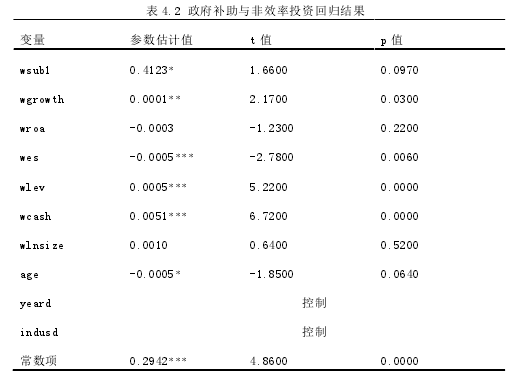 下表 4.1 為論文實(shí)證模型中一些關(guān)鍵和主要變量的相關(guān)性分析。從下表 4.1得出,政府補(bǔ)助、營業(yè)收入增長率、資產(chǎn)收益率水平、銷售費(fèi)用率、每股現(xiàn)金流與存在非效率投資的民營上市公司價(jià)值均在 1%的水平上顯著正相關(guān);資產(chǎn)負(fù)債率水平、公司規(guī)模等與非效率投資的民營上市公司的價(jià)值均在 1%的水平上顯著負(fù)相關(guān),這說明政府補(bǔ)助對提升非效率投資類民營上市公司的公司價(jià)值具有明顯效果,公司成長性、盈利能力等均能提升公司價(jià)值,過高的財(cái)務(wù)杠桿對公司價(jià)值起到負(fù)面效果、降低了公司的價(jià)值。政府補(bǔ)助、營業(yè)收入增長率、資產(chǎn)負(fù)債率、公司規(guī)模、每股現(xiàn)金流與非效率投資行為都存在顯著的正相關(guān)關(guān)系,銷售費(fèi)率水平與非效率投資行為在 1%水平上存在顯著負(fù)相關(guān)性,這說明成長性好、現(xiàn)金充裕公司更容易導(dǎo)致非效率投資問題的發(fā)生。下表 4.2 為民營上市公司政府補(bǔ)助與非效率投資的回歸結(jié)果。從表中得出,民營上市公司政府補(bǔ)助與非效率投資行為存在顯著的正相關(guān)關(guān)系,這表明民營上市公司獲得政府補(bǔ)助資金在一定程度上加重了非效率投資問題,這驗(yàn)證政府“ 掠奪之手” 相關(guān)理論,政府補(bǔ)助并未能真正起到提高資金的投資效率及改善民營上市公司整體非效率投資現(xiàn)狀的效果。公司的營業(yè)收入增長率、資產(chǎn)負(fù)債率水平、每股經(jīng)營活動(dòng)產(chǎn)生的現(xiàn)金流量凈額、公司規(guī)模均與非效率投資存在顯著正相關(guān)性,這表明成長性越良好、資產(chǎn)負(fù)債率水平越高、現(xiàn)金流越充足、規(guī)模越大的民營上市公司,越容易導(dǎo)致非效率投資行為的加大。政府補(bǔ)助一方面加大自由現(xiàn)金流充裕公司的非效率投資行為;另一方面,也會(huì)導(dǎo)致一些公司高管過度自信、盲目擴(kuò)張及投資行為的發(fā)生,這些行為會(huì)進(jìn)一步加劇民營上市公司的非效率投資問題,這驗(yàn)證了 H1,即政府補(bǔ)助對民營上市公司的投資扮演了 “掠奪之手”角色。