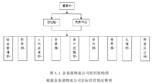 北京金泰港物流有限公司(以下簡(jiǎn)稱金泰港物流公司),注冊(cè)成立于 2010 年 11月,注冊(cè)資金 6000 萬(wàn)元,由北京金泰集團(tuán)有限公司全資設(shè)立。北京金泰集團(tuán)有限公司(以下簡(jiǎn)稱金泰集團(tuán)),注冊(cè)資本 9.15 億元,致力于做最卓越的城市服務(wù)運(yùn)營(yíng)商,權(quán)屬單位 89 家,在北京城區(qū)擁有 342 個(gè)經(jīng)營(yíng)網(wǎng)點(diǎn)資源,經(jīng)營(yíng)范圍主要包括現(xiàn)代物流、燃料經(jīng)營(yíng)、旅游飯店、物業(yè)經(jīng)營(yíng)與管理、汽車銷售、超市、廚房設(shè)備、機(jī)械加工等多個(gè)領(lǐng)域,經(jīng)營(yíng)區(qū)域分布在北京市城區(qū)及房山、門頭溝、延慶、大興等區(qū)縣,“十二五”期間收入已經(jīng)逾 100 億元,目前正在努力向“百年金泰、幸福金泰”發(fā)展。金泰港物流公司主要經(jīng)營(yíng)鋼貿(mào)物流、國(guó)際/國(guó)內(nèi)貿(mào)易以及倉(cāng)儲(chǔ)租賃等業(yè)務(wù),致力于打造一流的現(xiàn)代化國(guó)際物流園區(qū),目前已經(jīng)吸引了普洛斯、廣州本田等優(yōu)質(zhì)客戶入住。 目前金泰港物流公司所提供物流服務(wù)基本上都是傳統(tǒng)的物流服務(wù)模式,比如:鋼材倉(cāng)儲(chǔ)、裝卸搬運(yùn)等常規(guī)的物流服務(wù),其余的基本上以場(chǎng)地、庫(kù)房租賃為主,在實(shí)際物流運(yùn)營(yíng)中沒(méi)有提供物流增值服務(wù),對(duì)于公司發(fā)展現(xiàn)代化物流來(lái)說(shuō)還處于起步階段。具體見圖 4.1 金泰港物流公司組織架構(gòu)圖。