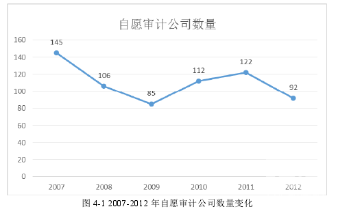 考慮到滬深兩市交易所在2006 年和2012年都對(duì)中期財(cái)務(wù)報(bào)告審計(jì)制度進(jìn)行了修訂,為了控制制度背景的變化對(duì)樣本選擇的影響,我們以 2007-2012 年進(jìn)行中期財(cái)務(wù)報(bào)告自愿審計(jì)的滬深兩市 A 股主板公司為自愿審計(jì)樣本。 基本的樣本選擇思路是:先找到 2007-2012 年所有進(jìn)行過中期財(cái)務(wù)報(bào)告審計(jì)的公司,再?gòu)倪@些公司中減去中期財(cái)務(wù)報(bào)告強(qiáng)制審計(jì)的公司。選取強(qiáng)制審計(jì)公司是以符合論文第二章制度背景中證監(jiān)部門規(guī)定的上市企業(yè)中期財(cái)務(wù)報(bào)告強(qiáng)制審計(jì)的條件為標(biāo)準(zhǔn),選擇出符合監(jiān)管部門的中期財(cái)務(wù)報(bào)告強(qiáng)制審計(jì)要求而被強(qiáng)制進(jìn)行審計(jì)的樣本為強(qiáng)制審計(jì)公司。其次,我們?cè)谒x擇出的中期財(cái)務(wù)報(bào)告自愿審計(jì)樣本中減去國(guó)泰安(CSMAR)數(shù)據(jù)庫(kù)中數(shù)據(jù)缺失的樣本(考慮研究樣本一致性的條件),剔除了 ST、PT 和金融類上市公司(這些公司與其他公司在治理結(jié)構(gòu)、金融模式及盈余模式等方面差別很大,不滿足樣本的代表性原則)。 最后,得到中期財(cái)務(wù)報(bào)告自愿審計(jì)過的公司共 662 家,其中 2007 年 145 家,2008 年 106 家,2009 年 85 家,2010 年 112 家,2011 年 122 家,2012 年 92 家。圖 4-1 展示了 2007-2012 年自愿審計(jì)公司的數(shù)量變化,可見我國(guó)自愿審計(jì)公司的數(shù)量在 2007-2009 年是連續(xù)下降,在 2010-2012 年又有所上升。特別是 2009 年進(jìn)行自愿審計(jì)的上市公司數(shù)量為這個(gè)階段的最低點(diǎn),產(chǎn)生這種現(xiàn)象的原因極可能與 2008 年的全球性金融危機(jī)有著千絲萬縷的聯(lián)系。金融危機(jī)導(dǎo)致了公司業(yè)績(jī)的下滑,讓投資者對(duì)公司未來的前景失去了信心。所以,投資者對(duì)外部審計(jì)需求會(huì)受到經(jīng)濟(jì)環(huán)境的影響??傮w來說 2007-2012 年每年進(jìn)行自愿審計(jì)公司的數(shù)量保持在 110 家左右。