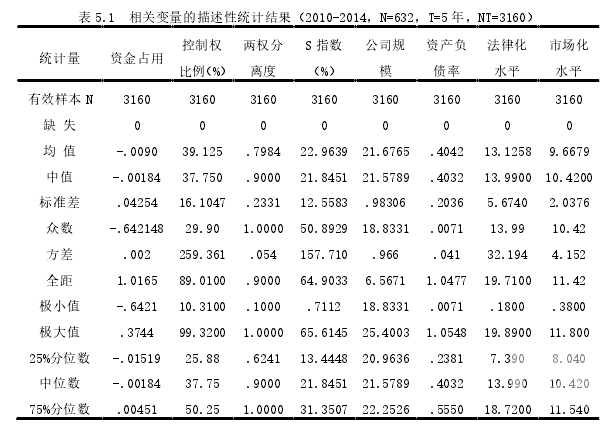 本文主要變量的描述性統(tǒng)計結(jié)果如表 5.1 所示,我國家族上市公司終極股東的掏空行為存在很大的差異,說明終極股東可能會在受到各類因素的影響下對公司做出不同程度的掏空行為。 通過表 5.1 可以發(fā)現(xiàn),我國家族上市公司終極股東的控制權(quán)比例的區(qū)間跨度非常大,從 10.31%到 99.32%,均值為 39.13%,中位數(shù)為 37.75%,說明全部樣本中有 50%以上的終極股東的控制權(quán)在 37.75%以上,說明我國家族上市公司的股權(quán)比較集中,家族上市公司的終極股東有對上市公司的資產(chǎn)掏空和侵占中小股東及外部投資者的動機和能力。而第二至第十大股東的持股比例之和的均值僅為 22.96%,說明我國家族上市公司的第二至第十大股東的持股比例較小,對終極股東的制衡作用也較為薄弱。家族上市公司的兩權(quán)分離度的均值為 0.7984,表明在我國家族上市公司中,終極股東的控制權(quán)與現(xiàn)金流權(quán)分離現(xiàn)象嚴(yán)重,終極股東有對上市公司的資產(chǎn)掏空和侵占中小股東及外部投資者的動機和能力。 在利益掏空方面,資金占用水平的最小值為-0.6421,最大值為 0.3744,均值為-0.0090,中位數(shù)為-0.00184,說明全部樣本中有 50%以上的終極股東對家族上市公司實施了掏空行為。我國家族上市公司中,終極股東對上市公司的資金占用現(xiàn)象較為嚴(yán)重。  在資產(chǎn)負(fù)債率方面,雖然均值 40.42%較為正常,但是可以看出我國家族上市公司的資產(chǎn)負(fù)債率差異很大,有些公司甚至超過了 100%,可能會存在嚴(yán)重的掏空行為。 公司規(guī)模的標(biāo)準(zhǔn)差為 0.98,說明我國家族上市公司的公司規(guī)模的差距較小。 我國的省市自治區(qū)非常多,在市場化水平和法律化水平方面差距也非常大,法律化水平均值為 13.13,市場化水平均值為 9.67,整體來說我國在市場化和法律化的建設(shè)方面還需要加強和完善。