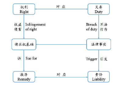 在探討侵害權(quán)益得利及其返還之前,我們有必要對私法中的“權(quán)利-義務(wù)”、“救濟-責(zé)任”的構(gòu)造體系稍作梳理,再將其還放入這一構(gòu)造中,以明確相關(guān)概念。根據(jù)民法基本理論,一人之權(quán)利(right)對應(yīng)的是他人之義務(wù)(duty),這里的義務(wù)既可能是積極、又可能是消極的,既可能是法定的、又可能是約定的。而一人的不法行為(wrong),作為或不作為,是對其義務(wù)的違反(breach of duty),并同時形成對他人權(quán)益的侵害(infringement of right)。進(jìn)而,如果行為人的不法行為滿足了某一法律事實的構(gòu)成要件,則權(quán)利人可依據(jù)相應(yīng)的請求權(quán)基礎(chǔ)(Anspruchsgrundlage)或訴因(causes  of  action)向法院主張救濟(remedy),相對地,行為人則因其違反義務(wù)之不法行須為承擔(dān)法律責(zé)任(liability)。此構(gòu)造如下圖: 在框架中,責(zé)任是法律關(guān)系一方主體違反自身義務(wù)或侵犯他人權(quán)利時,依照法律應(yīng)承擔(dān)的強制性法律后果;這種強制性法律后果,在大陸法系被稱為一種“債”,而在英美法系被稱為一種“救濟”。① 如果把侵害權(quán)益得利這一法律事實放入上圖的框架中,那么行為人因其侵害他人權(quán)益的行為而獲得了利益,違反了法定的不作為義務(wù),因此應(yīng)承擔(dān)得利返還的責(zé)任;而對權(quán)利人而言,其權(quán)益因為行為人的侵害行為而受到損害,因此可以主張得利返還之救濟。但這一“侵害權(quán)益得利—得利返還”的構(gòu)造,尚需解決兩個根本性問題,第一,得利返還救濟/責(zé)任承擔(dān)方式的正當(dāng)性問題,即為什么侵害權(quán)益得利之法律事實可以引發(fā)法律上的返還效果;第二,如果可以引發(fā)得利返還,那么得利返還的請求權(quán)基礎(chǔ)是什么。在探討這兩個根本性問題之前,我們首先要對所謂侵害權(quán)益得利行為進(jìn)行充分的理解,并明確其在現(xiàn)有法律概念體系中的坐標(biāo)。