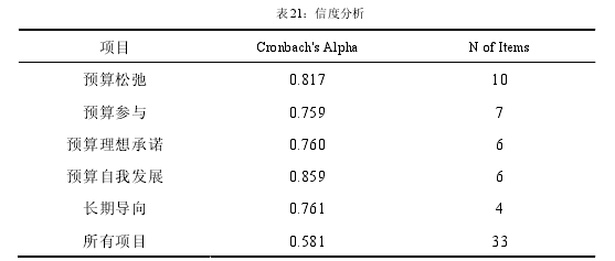 樣本的信度即樣本的可靠性的分析,  Cronbach  α 信度系數(shù)是最常用來衡量可靠性的,根據(jù) nunnally(1978)的建議,Cronbach α 信度系數(shù)在 0.5-0.7 之間為可信,量表的信度系數(shù)最好在 0.7-0.9 時為很可信。因此,可以看出本文整個問卷和各變量取得的數(shù)據(jù)都在可信指標以上,表明問卷可信度較好。 具體如下表所示:  內(nèi)容效度指的是測量目標與測量內(nèi)容之間的適合性與相符性。在問卷編制過程中,我們嚴格界定了問卷的內(nèi)容范圍,即從預算在企業(yè)管理中的重要性,到預算管理"人文化”的發(fā)展趨勢,再具體結(jié)合前人在預算松弛、預算參與、組織文化和薪酬方案的研究成果進行歸納和分析。問卷編制之后由會計專業(yè)人士及財務管理專業(yè)的人士進行了討論修訂,一致評價該問卷編制得較好。結(jié)構(gòu)效度是指測量工具反映概念和命題的內(nèi)部結(jié)構(gòu)的程度。它一般是通過測量結(jié)果與理論假設相比較來進行檢驗。主成分分析法是測量結(jié)構(gòu)效度的常用方法,并同時運用最大方差旋轉(zhuǎn)法,得出 KMO 值和 Bartlett 的球形度檢驗,來確定樣本數(shù)據(jù)是否適合做因子分析。