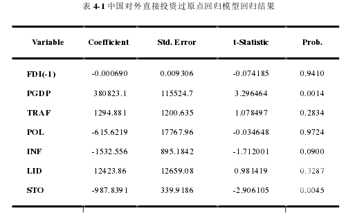 根據(jù)現(xiàn)有的文獻(xiàn),中國(guó)由于其特殊的經(jīng)濟(jì)、政治、文化背景,其對(duì)外直接投資活動(dòng)往往是由政府主導(dǎo),而且表現(xiàn)出特殊性。那么,第三章中我們得到的世界范圍內(nèi)的企業(yè)在中國(guó)周邊國(guó)家進(jìn)行投資時(shí),經(jīng)濟(jì)因素所起到的作用是否與中國(guó)在這些國(guó)家進(jìn)行 OFDI 時(shí)相同呢?為了驗(yàn)證上述疑問(wèn),本章將建立與第三章相對(duì)應(yīng)的面板數(shù)據(jù)模型,來(lái)考察經(jīng)濟(jì)因素對(duì)中國(guó) OFDI 的影響。 下面我們針對(duì)中國(guó)對(duì)周邊國(guó)家對(duì)外直接投資活動(dòng)進(jìn)行計(jì)量分析。為了便于比較分析,我們?nèi)赃x取上一章的自變量,即,對(duì)外直接投資競(jìng)爭(zhēng)程度 FDI(-1)、市場(chǎng)規(guī)模(PGDP)、經(jīng)濟(jì)開放程度(TRAF)、制度質(zhì)量(POL)、通貨膨脹率(INF)、國(guó)際資本流動(dòng)風(fēng)險(xiǎn)(LID)、金融發(fā)展水平(STO)。因變量選取中國(guó)對(duì)各國(guó)的對(duì)外直接投資流量,數(shù)據(jù)來(lái)源于對(duì)外直接投資統(tǒng)計(jì)公報(bào)。