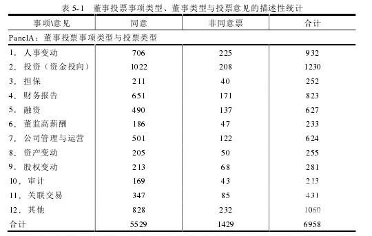 與西方國家上市公司的董事表決情況不強(qiáng)制披露的制度不同,中國為了提高董事會決策有效性,保護(hù)投資者利益,發(fā)布了《上海(深圳)證券交易所股票上市規(guī)則(2004 年修訂),強(qiáng)制要求中國 A 股上市公司披露董事會投票表決數(shù)據(jù):包括每項(xiàng)提案獲得同意、反對和棄權(quán)的票數(shù),以及相關(guān)董事投反對或者保留意見的理由。因此本文基于披露的董事投票數(shù)據(jù),參考陸正飛等(2015)、葉康濤(2011)利用董事投票數(shù)據(jù)在董事監(jiān)督、獨(dú)立性方面的研究,用董事投非贊成票數(shù)據(jù)來作為董事監(jiān)督的衡量指標(biāo)。按照這個定義,本文采用“公司—年度—議案”的數(shù)據(jù)結(jié)構(gòu)構(gòu)造了樣本,最終得到 2012-2014 年 3 年總共 6958 個觀測值樣本。董事類型、投票事項(xiàng)類型及投票意見、存在董事投非贊成票的公司描述性統(tǒng)計如表 5-1、5-2所示。由表 5-1Panel A 對董事投票事項(xiàng)類型與投票類型的描述性統(tǒng)計可以看出,董事會議案中被投非贊成票的主要事項(xiàng)為人事變動、投資、融資活動、財務(wù)年度報告和其他,這些議案事項(xiàng)通常也是股東與管理層、控股股東與非控股股東利益沖突、矛盾較為集中的關(guān)鍵點(diǎn)。這從一定程度上說明,董事投非贊成票是其積極履行監(jiān)督職責(zé)的重要方式。從表 5-2 存在董事投非贊成票的公司描述性統(tǒng)計表發(fā)現(xiàn),在 2012-2014 三年樣本期間,存在董事投非贊成票的比例為 13.99%,表明越來越多的公司存在異議董事,董事更積極監(jiān)督,敢于“發(fā)聲”來監(jiān)督管理層和控股股東行為,保護(hù)中小投資者的利益;且在非國有企業(yè)中,異議董事占比更多,在某種程度上可以推測,董事監(jiān)督作用在國企中受到干預(yù)制約更嚴(yán)重。由于國有企業(yè)所有權(quán)虛置,政府干預(yù)企業(yè)投資行為,且公司治理的缺陷導(dǎo)致董事監(jiān)督在企業(yè)中形同虛設(shè),不能發(fā)揮作用。