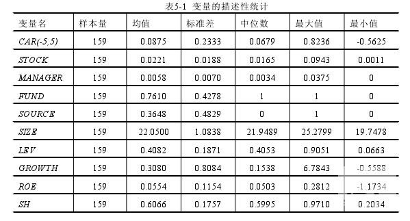 本文對(duì)各主要變量的樣本量、均值、標(biāo)準(zhǔn)差、中位數(shù)、最大值和最小值進(jìn)行描述,具體情況如下圖。從描述性統(tǒng)計(jì)圖中可以看出,累計(jì)超額收益率CAR(-5,5)的均值0.0875以及中位數(shù)0.0681顯著大于0,即在公告日當(dāng)天大多數(shù)上市公司獲得了股票的超額收益,進(jìn)一步表明大部分投資者看好宣告實(shí)施員工持股計(jì)劃的上市公司,市場(chǎng)對(duì)于員工持股計(jì)劃宣告的反應(yīng)是正向的。員工激勵(lì)強(qiáng)度STOCK的均值為0.0221,中位數(shù)為0.0165,可以看出絕大多數(shù)上市公司選擇實(shí)施員工持股計(jì)劃的標(biāo)的股票的數(shù)量在2%左右(占總股本),可以看出我國(guó)上市公司實(shí)施員工持股計(jì)劃仍較為保守,股票數(shù)量較少。管理層激勵(lì)強(qiáng)度MANAGER的最小值為0,表達(dá)了有一些公司的員工持股計(jì)劃是專門針對(duì)員工的,高級(jí)管理人員、董事、監(jiān)事等并不參與其中。從MANAGER的均值0.0058以及STOCK的均值0.0221來看,管理層持股占計(jì)劃員工總持股比例的26%左右,占有相當(dāng)大的比重。這也表明了,雖然有少數(shù)公司的員工持股計(jì)劃是專門針對(duì)員工的,但大部分的上市公司同時(shí)借由員工持股計(jì)劃對(duì)管理層進(jìn)行激勵(lì)。從資金來源FUND的均值0.7610及中位數(shù)1可以看出上市公司實(shí)施員工持股計(jì)劃的資金來源主要為員工自籌方式。從股票來源SOURCE的均值0.3648及中位數(shù)0來看,上市公司更傾向于采取從二級(jí)市場(chǎng)購(gòu)買的方式。