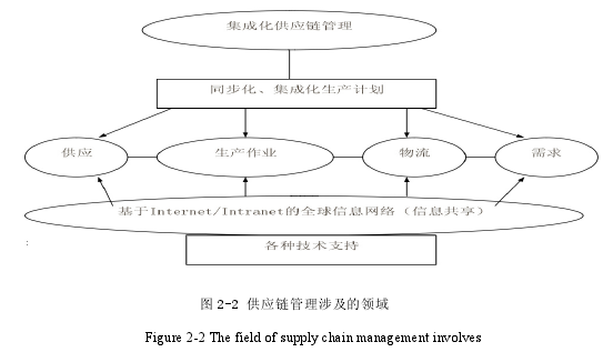 根據(jù)交通運(yùn)輸部對(duì)供應(yīng)鏈的定義:依托以互聯(lián)網(wǎng)為代表的信息技術(shù)統(tǒng)籌、配置物流、現(xiàn)金流、信息流等資源并采取科學(xué)合理的管理方法調(diào)配和周轉(zhuǎn)活動(dòng)[13]。供應(yīng)鏈管理要求企業(yè)之間進(jìn)行“強(qiáng)強(qiáng)聯(lián)合”,建立長(zhǎng)期合作伙伴關(guān)系, 將非核心業(yè)務(wù)委托給專業(yè)公司來(lái)完成,本身將有限資源運(yùn)用到核心業(yè)務(wù)上,通過(guò)業(yè)務(wù)流程改造,持續(xù)增強(qiáng)企業(yè)綜合競(jìng)爭(zhēng)力,同時(shí)從雙贏角度,還能為供應(yīng)鏈上其他企業(yè)創(chuàng)造更好的競(jìng)爭(zhēng)環(huán)境,實(shí)現(xiàn)共同發(fā)展。在下圖 2-1 中,我們給出企業(yè)供應(yīng)鏈上不同企業(yè)之間的關(guān)系圖,從中可以看出,一條完善的供應(yīng)鏈覆蓋了企業(yè)經(jīng)營(yíng)的產(chǎn)、供、銷等所有環(huán)節(jié)。 信息共享是供應(yīng)鏈管理實(shí)際運(yùn)用中重要基礎(chǔ)條件之一。供應(yīng)鏈管理需要企業(yè)在各個(gè)環(huán)節(jié)的支持,即在不同運(yùn)作節(jié)點(diǎn)進(jìn)行信息傳播和交流,所以,信息技術(shù)對(duì)于供應(yīng)鏈管理是其順利開(kāi)展的必要條件。隨著以互聯(lián)網(wǎng)、計(jì)算機(jī)為代表的信息技術(shù)不斷發(fā)展,供應(yīng)鏈管理獲得了更多技術(shù)手段支持, 企業(yè)之間信息共享水平得到顯著提升。[14] 供應(yīng)鏈管理主要涉及四個(gè)方面的內(nèi)容(如下圖 2-2):即物資供應(yīng)(Supply)、生產(chǎn)安排(Schedule Plan)、物流管理(Logistics)、需求分析(Demand),企業(yè)所有生產(chǎn)活動(dòng)都納入到其中[15]。其中不僅涉及到實(shí)物物資在供應(yīng)鏈環(huán)節(jié)之間的運(yùn)動(dòng)和流通,還包括供應(yīng)商遴選、物資需求、計(jì)劃制定、計(jì)劃實(shí)施、需求分析、庫(kù)存控制、用戶關(guān)系維護(hù)、售后服務(wù)以及現(xiàn)金流管理等。供應(yīng)鏈體系在被構(gòu)建的過(guò)程中,供應(yīng)鏈上各種業(yè)務(wù)單位之間的合作關(guān)系也在持續(xù)的鞏固和發(fā)展;這些選取出的業(yè)務(wù)伙伴有助于把原來(lái)對(duì)立的競(jìng)爭(zhēng)關(guān)系轉(zhuǎn)換成協(xié)同合作的伙伴關(guān)系[16]。這種建立在合作共贏基礎(chǔ)上的合作關(guān)系對(duì)供應(yīng)鏈上企業(yè)間的信息共享程度和水平提出了更高的要求,不僅要求這些企業(yè)之間實(shí)現(xiàn)銷售、庫(kù)存、需求、物流等信息的交換和利用,而且還得具有較高的利用效率。
