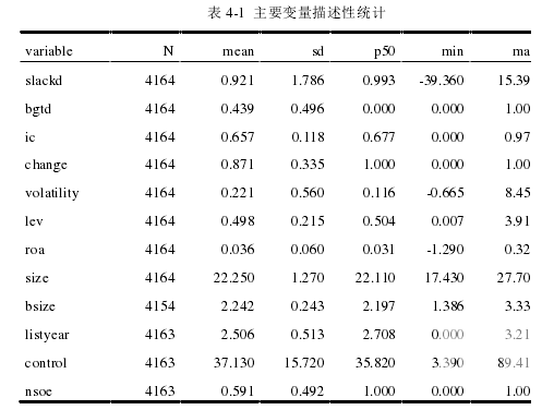 由上表 4-1 主要變量的描述性統(tǒng)計而知,從預(yù)算松弛程度看,slackd 均值和中位數(shù)分別為 0.921 和 0.993,說明采用潘飛(2008)對預(yù)算松弛的衡量方法,樣本中所選取的上市公司的營業(yè)收入增長率的預(yù)算值要比實際的行業(yè)平均營業(yè)收入增長率低了 7.2 個百分點,將近 10 個百分點,可見 2010 年-2015 年 A 股上市公司的預(yù)算松弛程度的狀況還是很嚴重的。從預(yù)算目標完成情況看,bgtd 均值和中位數(shù)分別為 0.439 和 0.496,說明在本文選取的樣本中有 43.9%的公司預(yù)算目標完成,但仍然有 56.1%的公司沒有完成上年末公司編制的預(yù)算收入的目標。從內(nèi)部控制指數(shù)上看,在本文選取的樣本公司中內(nèi)部控制指數(shù)的平均值為0.657,說明 2010 年-2015 年我國所有上市公司內(nèi)部控制制度實施平均都很好,內(nèi)部控制指數(shù)的標準差為 0.118,說明在本文選取的樣本公司中內(nèi)部控制有效性的差異比較大。 在所有控制變量中,從公司規(guī)模上看,size 的平均值是 22.250,說明樣本中公司的平均規(guī)模為 46.03 億,從企業(yè)風(fēng)險上看,Lev 的均值為 49.8%,從盈利能力上看,樣本中公司的 ROA 的均值為 3.6%,從企業(yè)性質(zhì)上看,在樣本中我們發(fā)現(xiàn)有 40.9%的公司為民營企業(yè)。綜上,本文的樣本特征總體與以往的文獻基本一致。