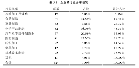 本研究大樣本調(diào)查的正式問(wèn)卷回收后共獲得了有效樣本 324 份。為了更清晰的展示樣本的總體情況,本部分對(duì)研究的企業(yè)特征、個(gè)體特征和所有變量進(jìn)行描述性統(tǒng)計(jì)分析。樣本企業(yè)覆蓋了東北地區(qū)、長(zhǎng)江三角洲地區(qū)和珠江三角洲環(huán)的石油加工及煉焦業(yè)、食品制造、家具制造、電子產(chǎn)品制造、汽車(chē)及零部件制造、醫(yī)藥制造、紡織加工、煙草加工、機(jī)械設(shè)備制造等行業(yè),基本上可以代表制造行業(yè)企業(yè)整體情況,具體分析情況如表 5.1 所示,汽車(chē)及零部件制造業(yè)占比最高為 20.68%,食品制造、電子產(chǎn)品制造、醫(yī)藥制造行業(yè)企業(yè)占比均超過(guò)了 10%以上,石油加工及煉焦、家具制造、紡織加工、煙草加工、機(jī)械設(shè)備制造行業(yè)企業(yè)占比均在 10%以下,其他行業(yè)企業(yè)占比 4.01%。 員工人數(shù)是管理學(xué)研究領(lǐng)域?qū)ζ髽I(yè)行為有重要影響的企業(yè)特征之一,是反映企業(yè)規(guī)模的重要指標(biāo)。如表 5.2 所示,研究樣本具有較大的分散性。在企業(yè)規(guī)模分布上,100 人以下占 10.80%,101-500 人占 17.59%,501-1000 人占 38.27%,1000 人以上占 33.33%。