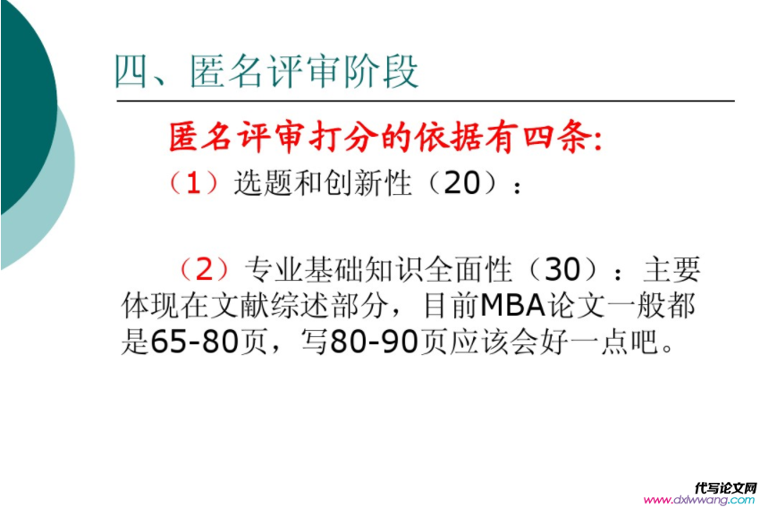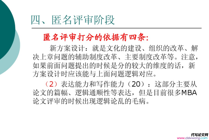 7、MBA論文的評(píng)價(jià)標(biāo)準(zhǔn)注重考查MBA研究生綜合應(yīng)用所學(xué)知識(shí)分析解決實(shí)際問(wèn)題的能力,應(yīng)在理論或方法上有新的見解,或?qū)鉀Q實(shí)際管理問(wèn)題有實(shí)用價(jià)值。