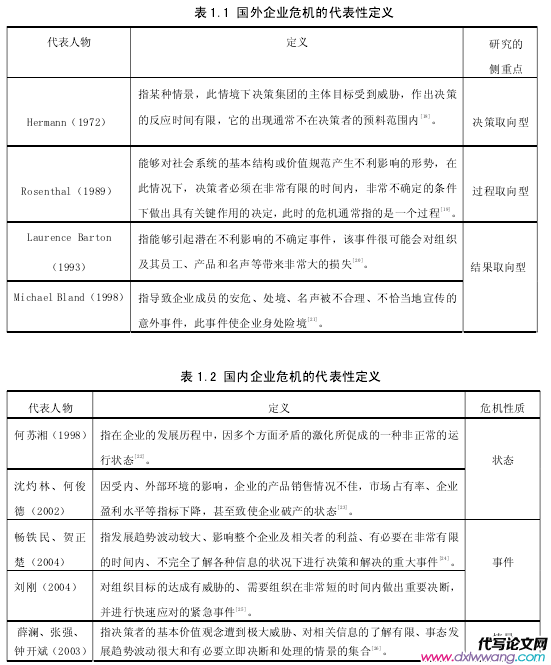 至于企業(yè)危機的概念,多年來學者們對其進行著不同的詮釋,而且提出了不同的理論觀點。學者們不同的理論觀點受到其個人立場、所處環(huán)境等多方面因素的影響,國內(nèi)外具有代表性的觀點詳見表 1.1 和表 1.2。